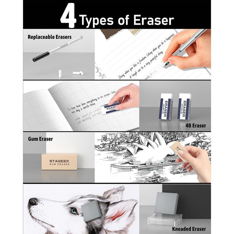 ·Four Types of Erasers: Includes a 4B white eraser, gum eraser, cap eraser, and kneaded eraser. The white eraser is for general use, the cap eraser for quick corrections, the gum eraser removes smudges, and the kneaded eraser is perfect for artists, ideal for lifting marks and blending.