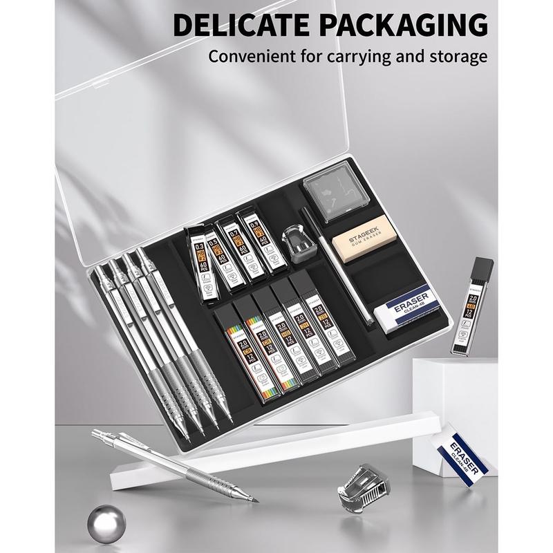 ·Exquisite Artist Set: Includes 5 PCS metal drawing mechanical pencils (0.3, 0.5, 0.7, 0.9, 2.0mm), 4 tubes of 0.3, 0.5, 0.7, and 0.9mm graphite lead refills, 4 tubes 2.0mm (4B, 2B, HB, 2H,) graphite lead refills, 2 tubes 12 color lead refills, 2pcs 4B soft erasers, a kneaded eraser, a gum eraser, 2pcs lead sharpener, 9pcs cap eraser refills, a plastic case.