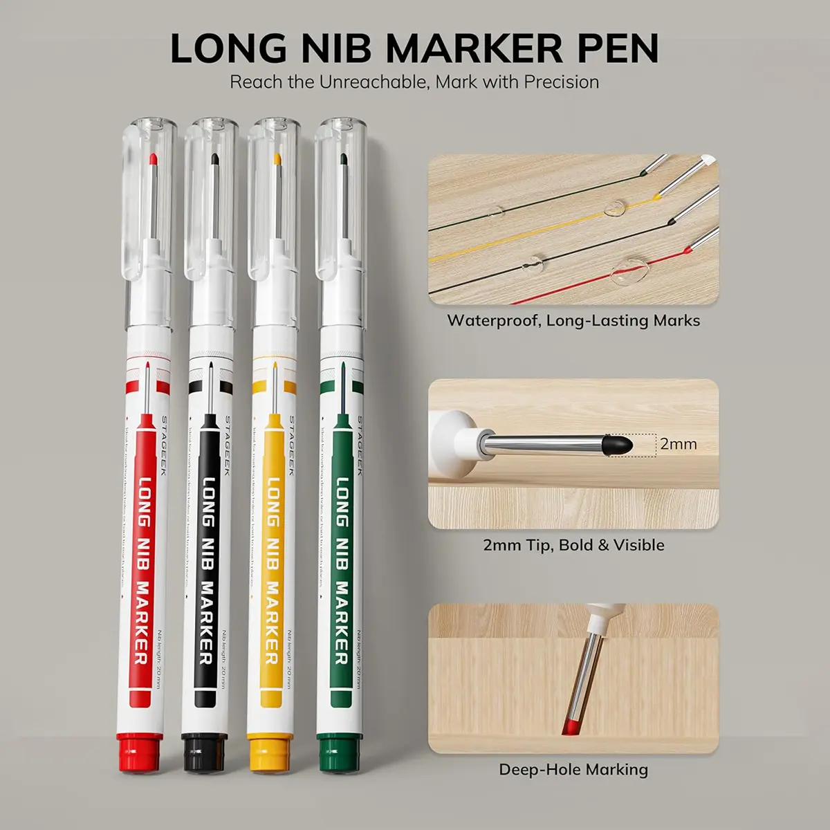 ·Deep Hole Marker Pens: Waterproof long nib markers, ideal for marking on surfaces where woodworking pencils can't, such as glass, metal, and plastic. These long head deep hole markers expand the versatility of the set, ensuring precise markings on various materials.
