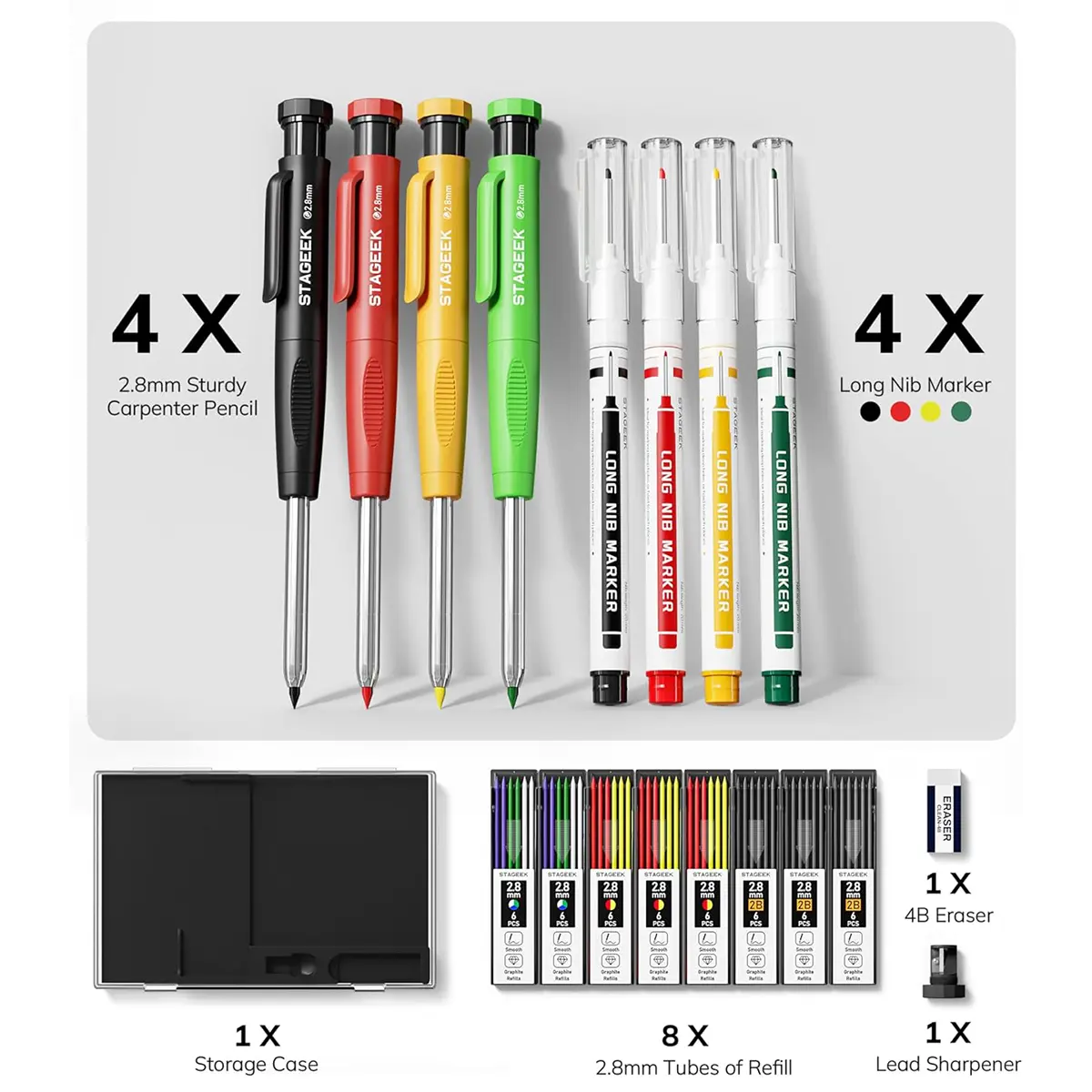 ·Exquisite Carpenter Pencil Set: Includes 4pcs sturdy woodworking pencils, 52pcs 2.8mm 2B lead refills in black, red, yellow, green, white and blue. You'll also receive 3pcs Long Nosed Marker Pens in red, black, and yellow ink, a plastic storage box for easy organization. Additionally, the set comes with a replaceable sharpener and a 4B eraser. With this comprehensive collection of tools, completing tasks becomes both swift and effortless.