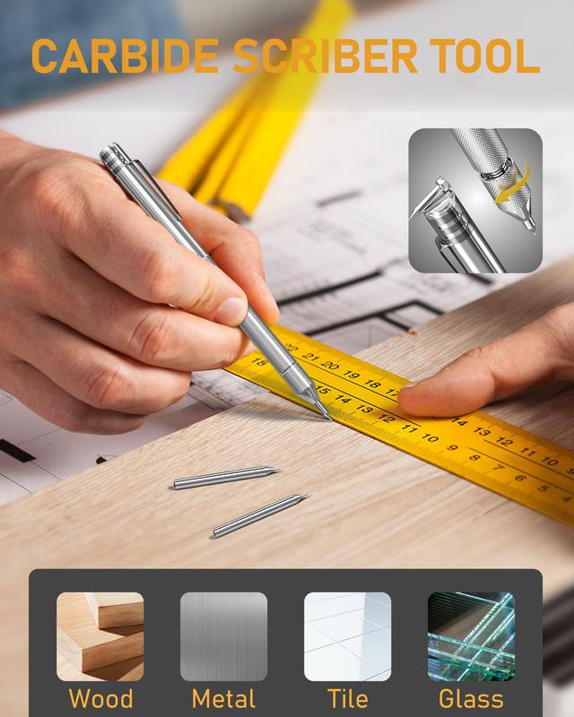 ·DEEP HOLE MARKER PENS: These long-tip, waterproof Marker Pens are perfect for marking on hard-to-reach surfaces such as glass, metal, and plastic—where traditional woodworking pencils may not suffice. The set's versatility is enhanced by these deep hole markers, offering precise marking across a variety of materials