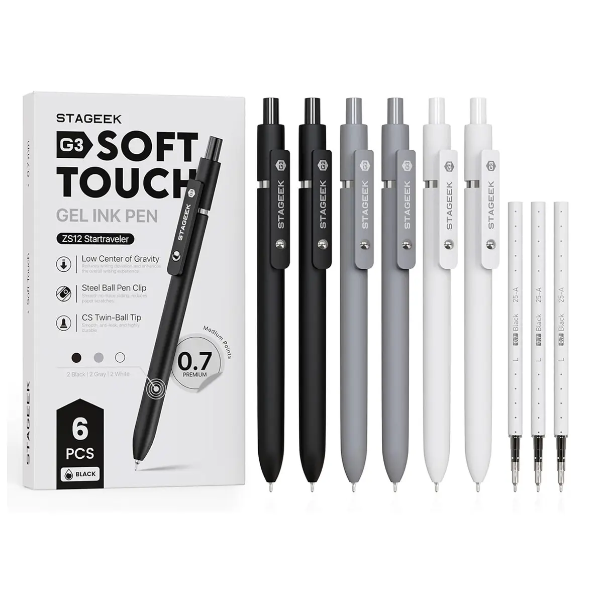 5. Black Gel Pens, 6Pcs 0.7mm Quick Dry Black Ink Pens with 3 Extra Refills, Fine Point Smooth Writing Pens for Journaling, Office, Note Taking, School Supplies, Nurse Aesthetic(Black Gray White&Gradient)