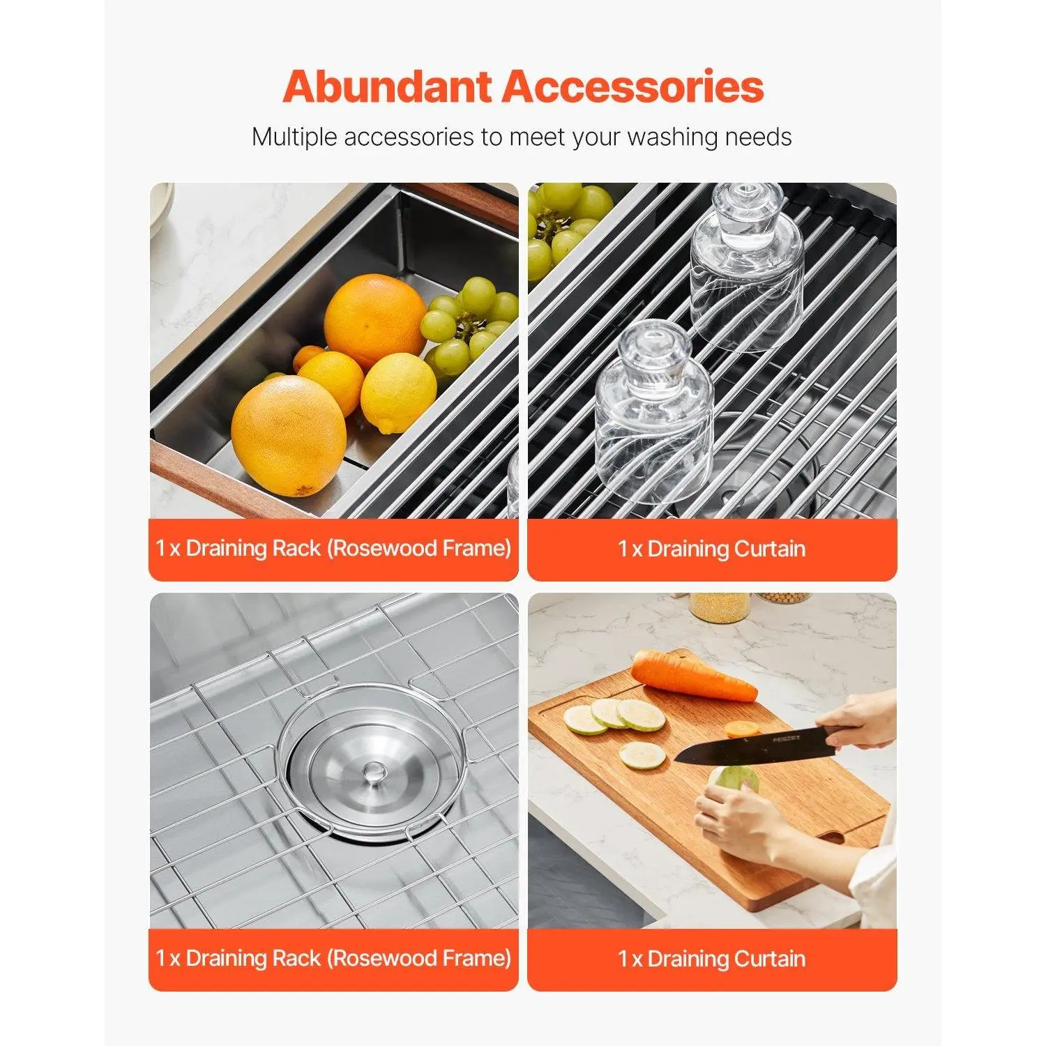 ·Workstation Kitchen Sink: The single-tier track workstation design allows accessories to slide over the sink, simplifying meal prep and cleanup without wasting kitchen counter space. Our household dishwasher sink have multiple accessories: drying rack (rosewood frame) x1, drying matx1, grid x1, cutting board (rosewood) x1.
