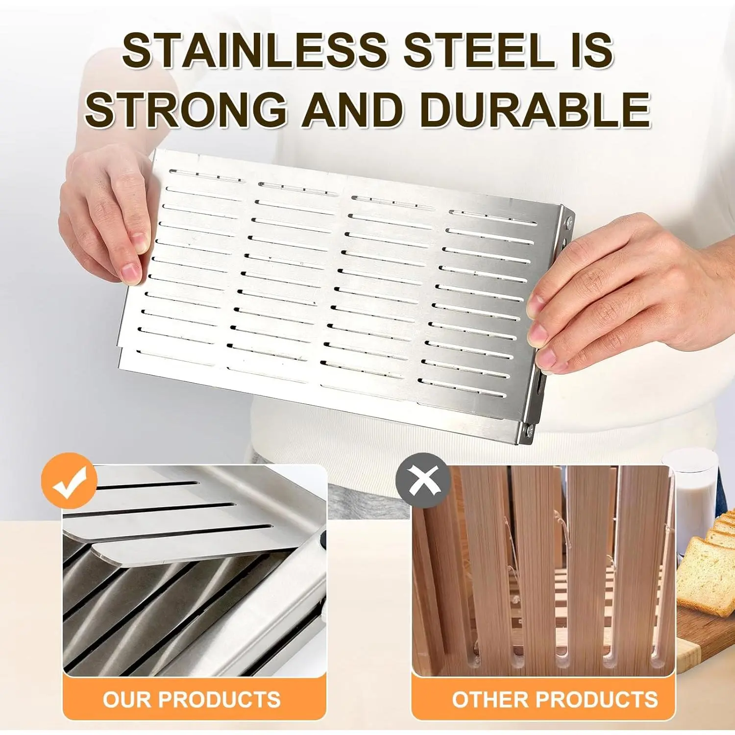 SUPERIOR QUALITY MAKINGS: The thin bread slicer guide is made of high quality stainless steel, Different from bamboo, wooden, plastic bread slicer. This sourdough bread slicer non-cracking, non-barbed, No wood chips,No bamboo chips. Our slicers are R-chamfered, safe and durable without injury to hands. Easy to Clean