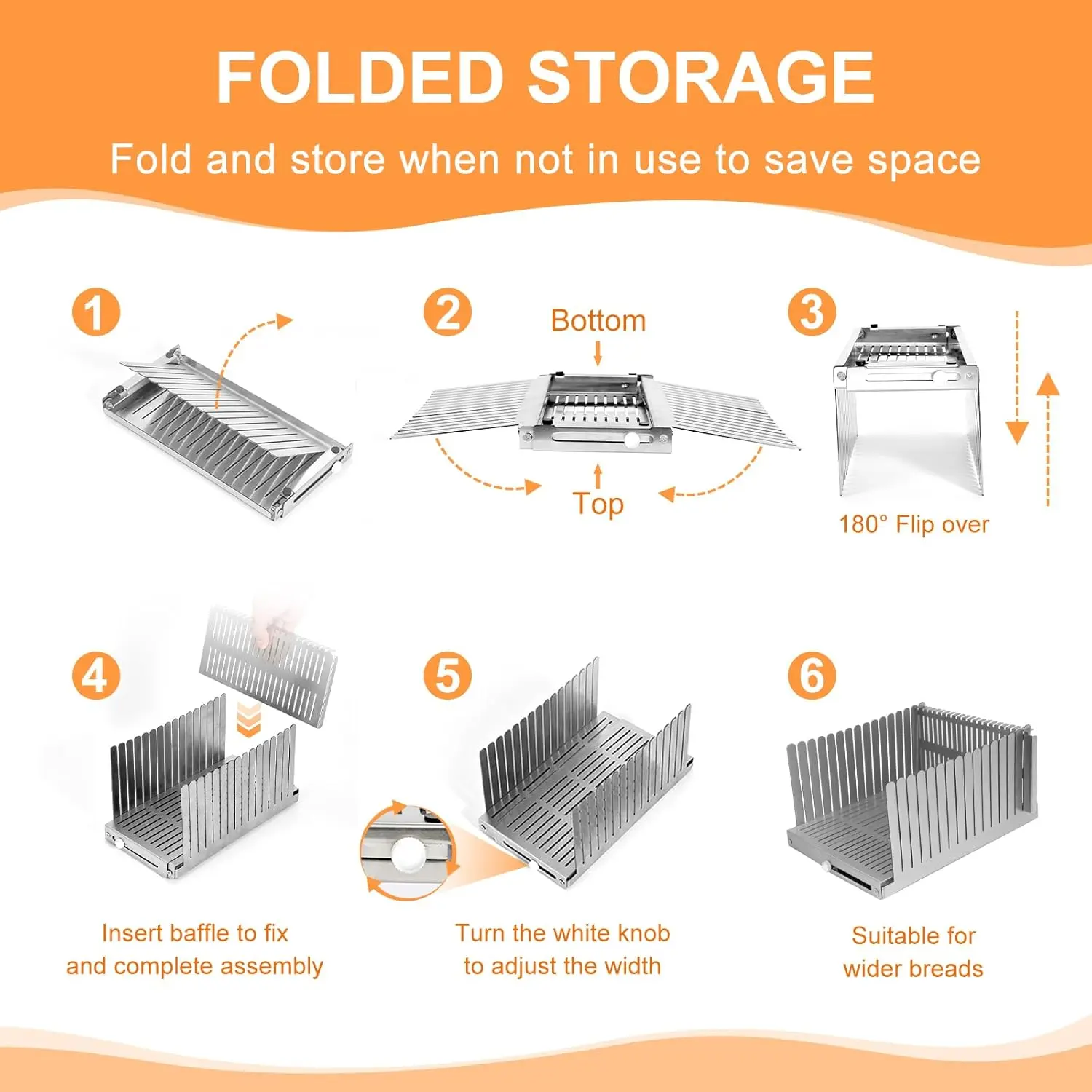 FOLDABLE &COMPACT &THIN: Our sourdough bread slicer maximizes your kitchen space and keeps it clean and organized, Adjustable width loaves up to 5.5"-8.3" width. Non-slip foot pads keep the bread slicer stays in place, making your bread slicing guide for homemade bread both safe and efficient. Fold bread sliecer thin and place anywhere in a kitchen shelf drawer or cupboard