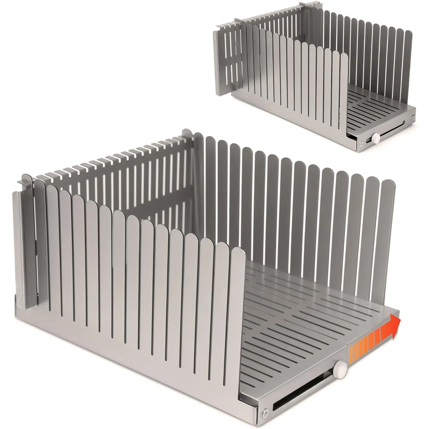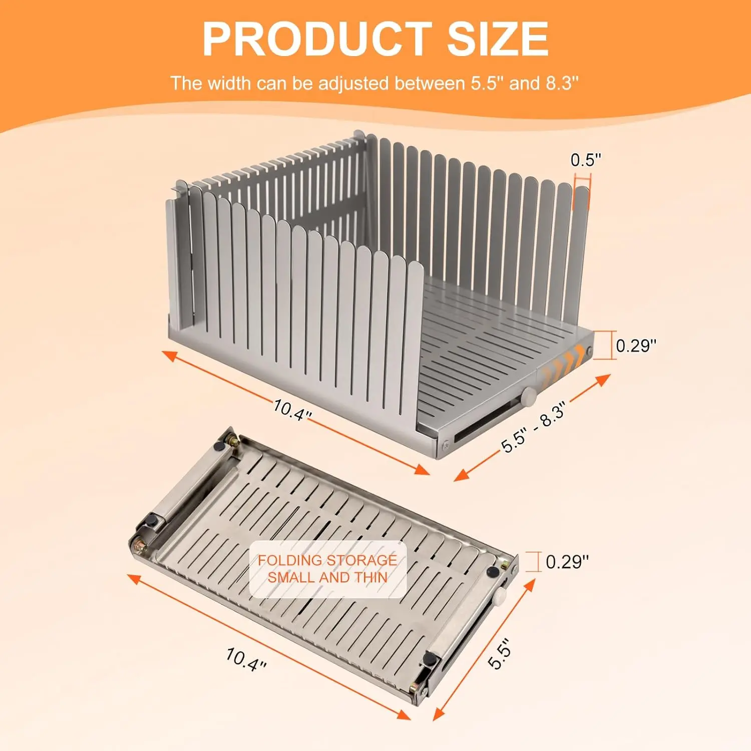 ADJUSTABLE WIDTH: Twist the screw to adjust the width of the bread slicer to fit different widths of bread(5.5"-8.3"), Makes Cutting Bagels, sourdough bread slice and even fruit. The width of the bread slicer is adjusted to the minimum size, and the thin slicer can be easy folded for convenient storage