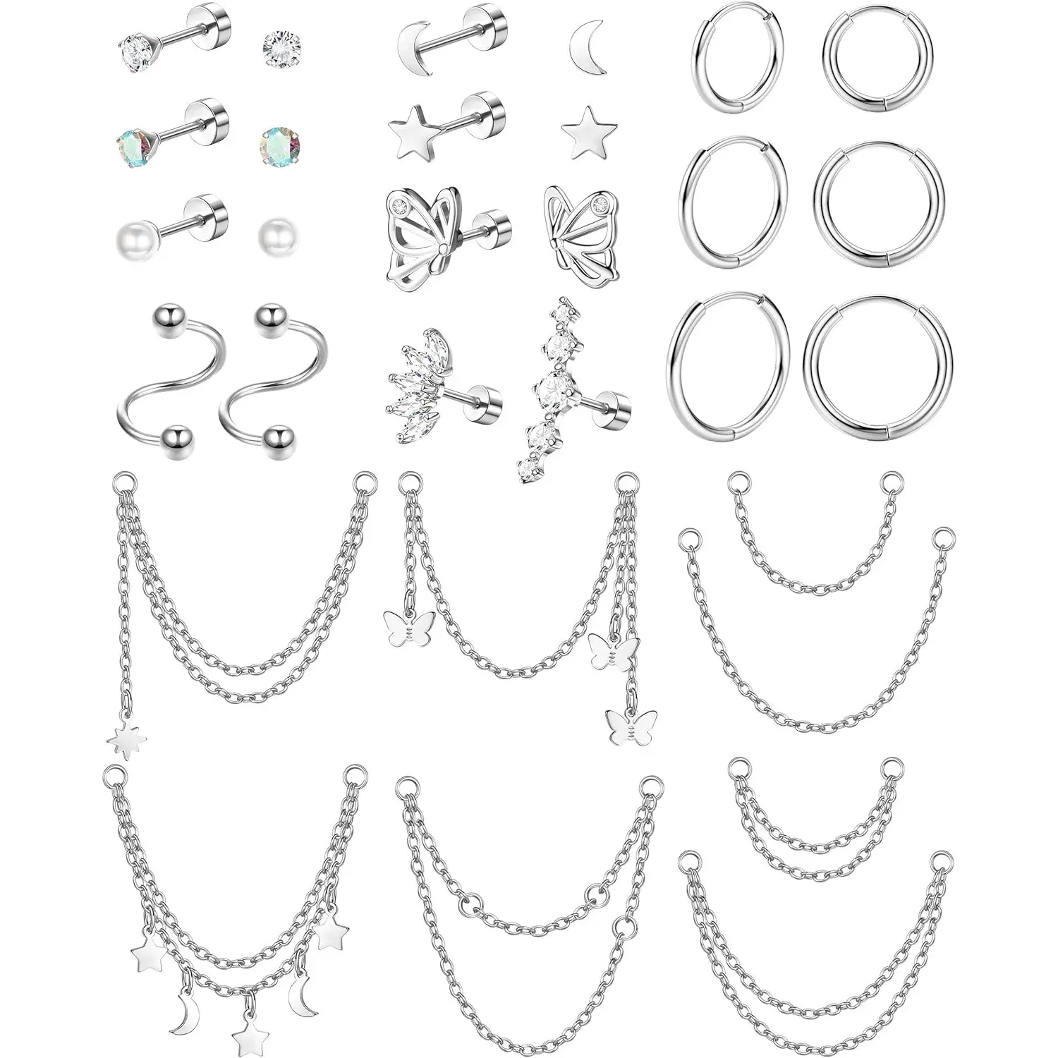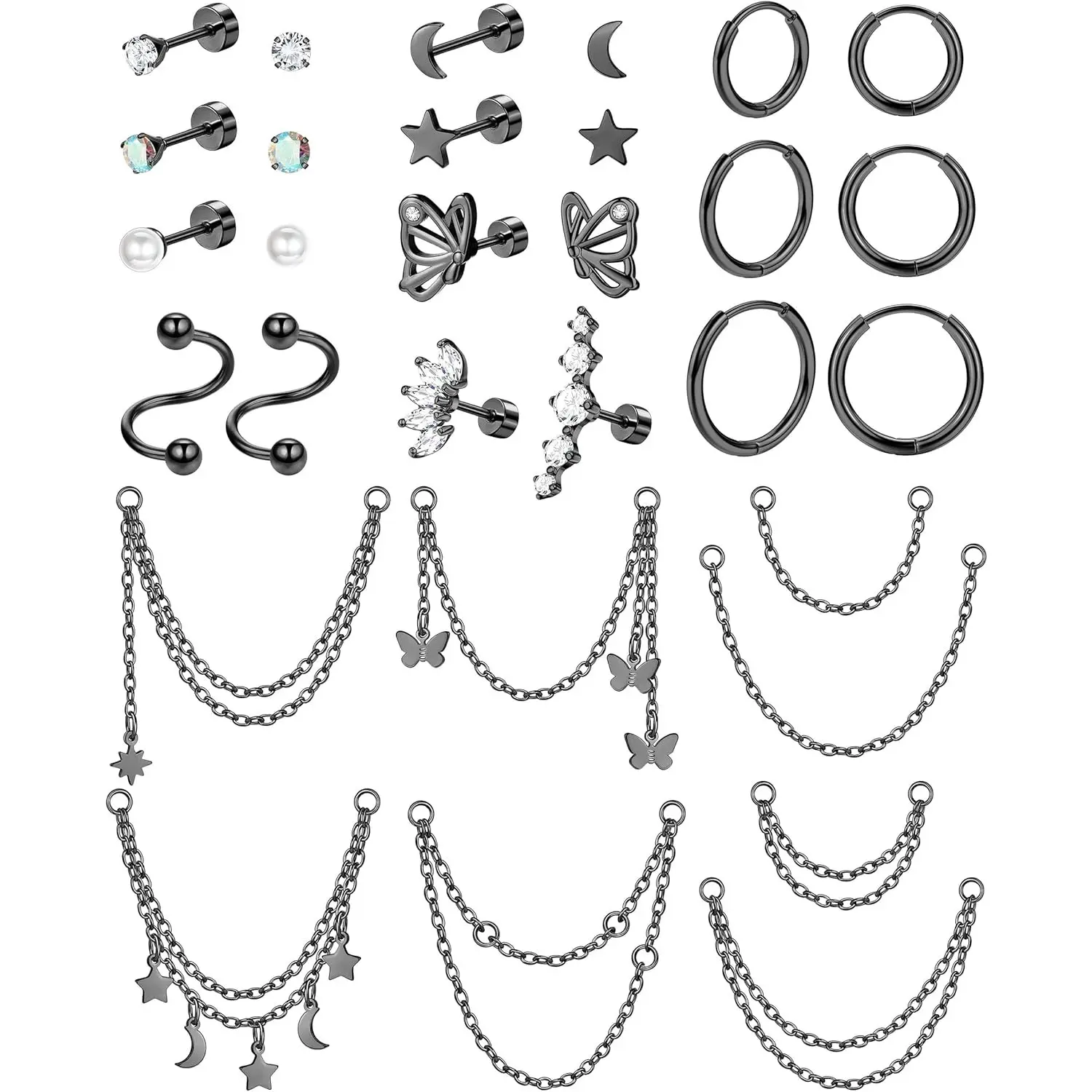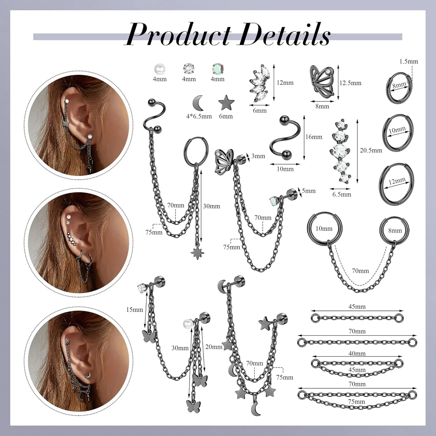Various Styles: Comes with 16Pcs Cartilage Stud Earrings and 6Pcs Small Huggie Hoop Earring and 8Pcs Chain Dangle Piercing. Chain Dangle Design and Various Kinds of Cartilage Piercing Jewelry Provide Different Collocation, Satisfy Your Changeful Demands, Just Enjoy the Fun of DIY.