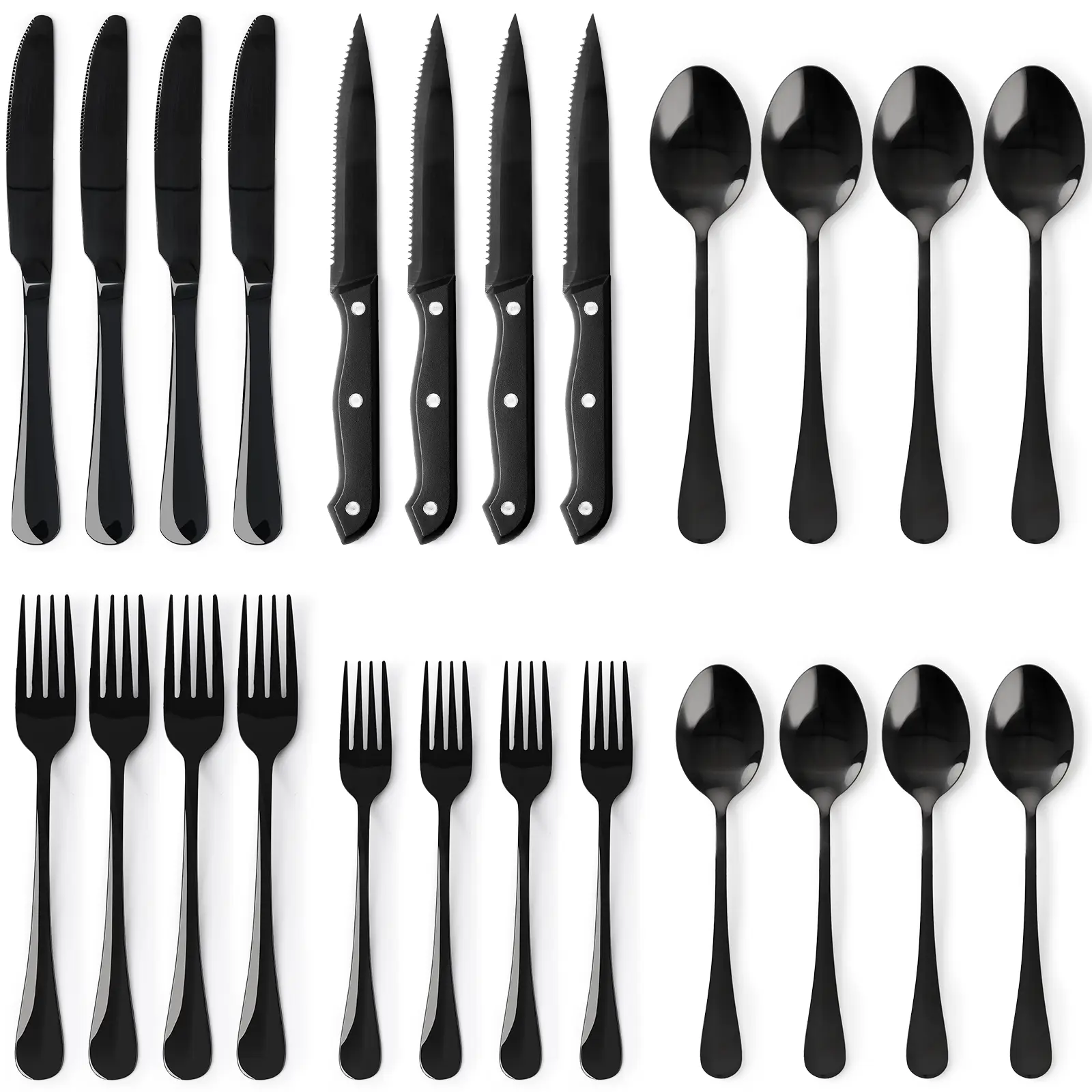 ·【GREAT VALUE FOR MONEY】: Each set includes 24 pieces, with 4 steak knives, making it perfect for a family of four or entertaining guests. Combining versatility with excellent value, this set is ideal for both everyday use and special occasions.