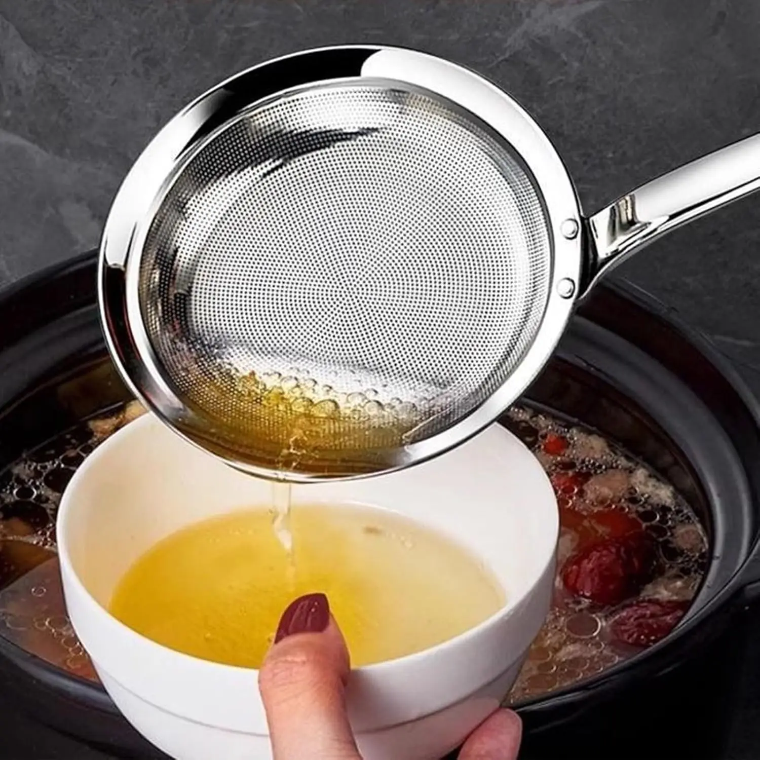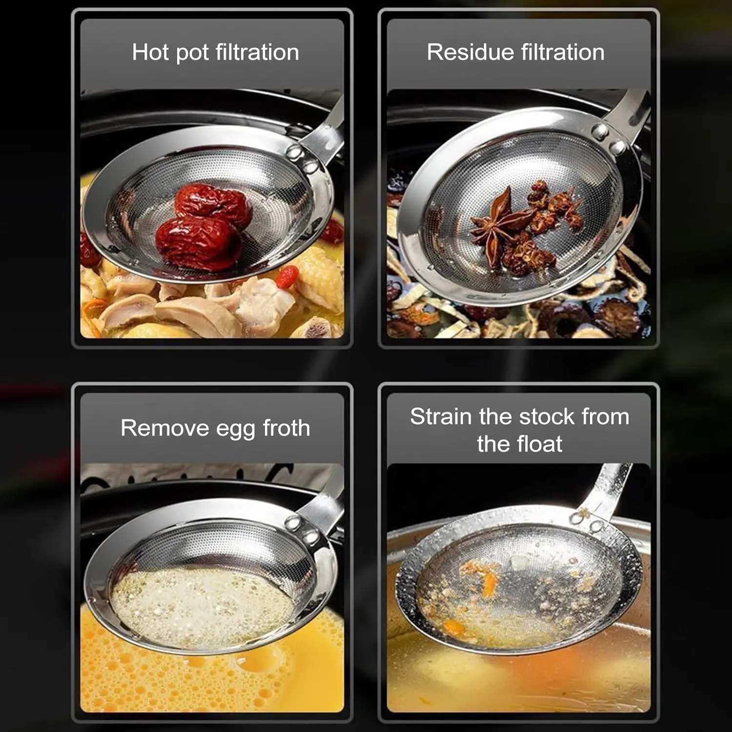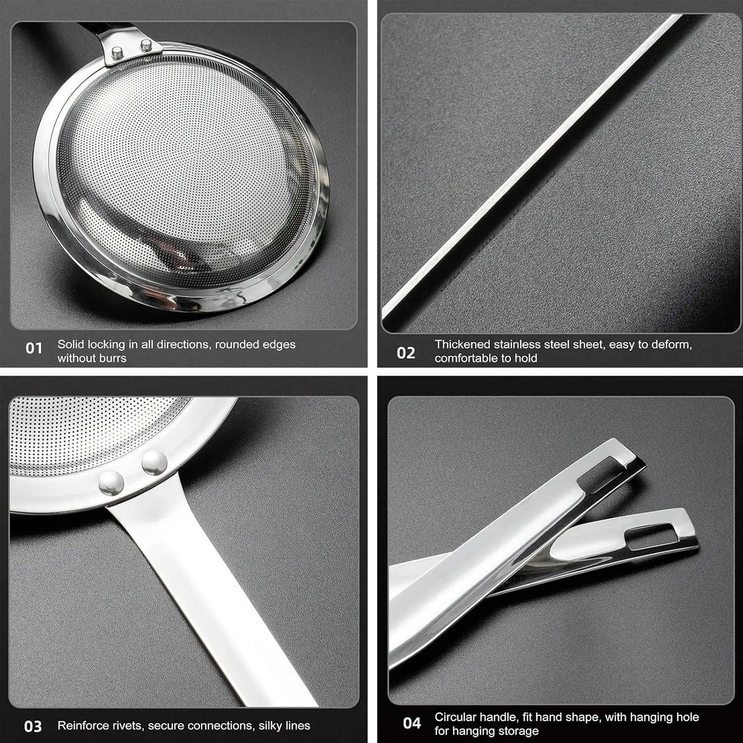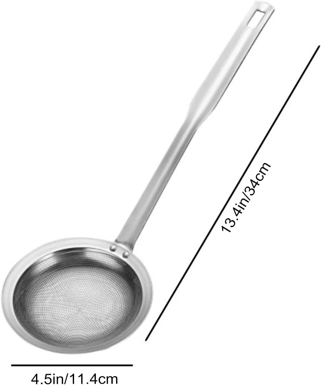 Cleaning the fine mesh screen is effortless; simply rinse with water after use to remove any residue.The handle includes a hanging hole for convenient storage and air drying, keeping your kitchen organized.Dishwasher safe.Mirrored, burr-free wire mesh screen won't scratch your hand while you clean it.