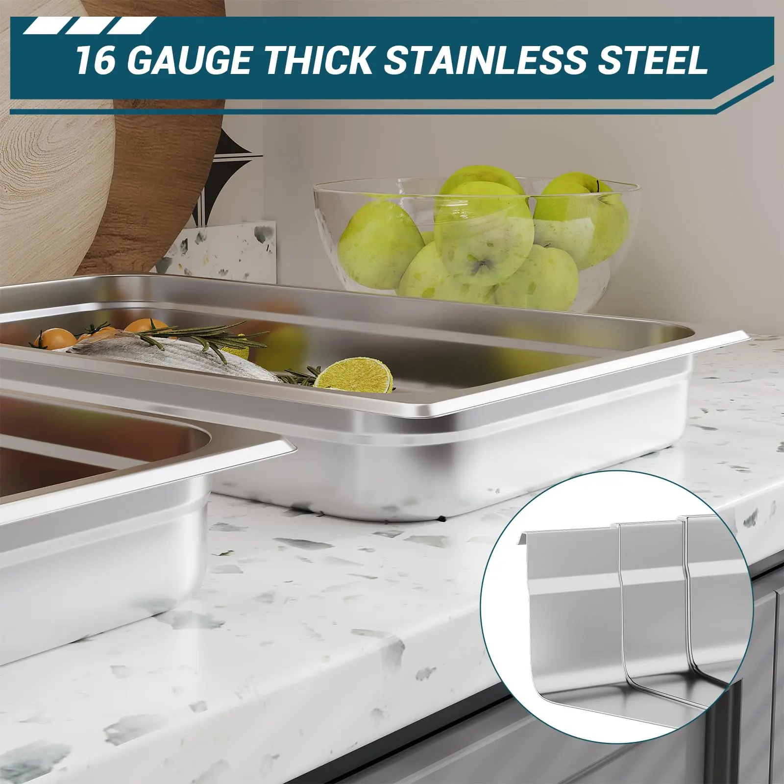 · Heavy-Duty 16 Gauge Stainless Steel: Made from durable 16 gauge thick stainless steel, the 6-pack food pan set is designed for commercial use. These pans can withstand the demands of catering and buffets, ensuring long-lasting performance in any kitchen