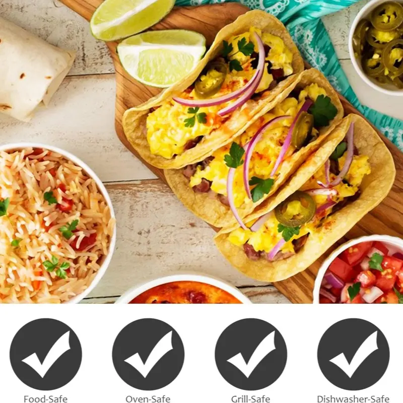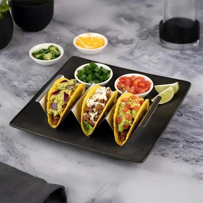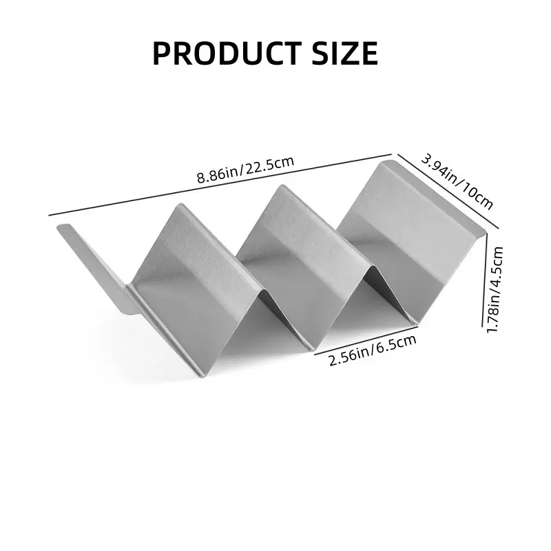 Taco Holder Set Material: Metal taco holder made of high-quality stainless steel, sturdy. No bending or deformation, Oven, grill and dishwasher safety.