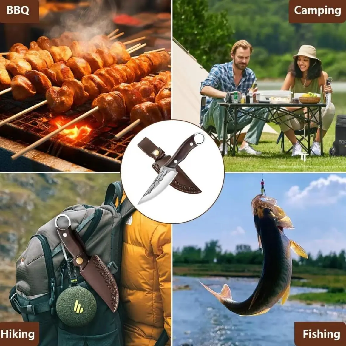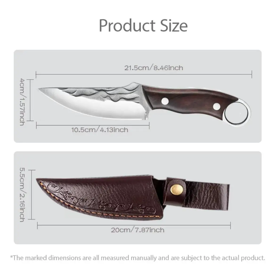 About the product SHARP AND FULL TANG BLADE KNIFE: Preferred stainlesssteel material, high temperature hardened edge is durableand sharp.Full tang construction, providing greater strengthand reliability, weighs tough and stable in your hand. MULTIPURPOSE: Fixed blade knife with wooden handle cancount on for camping, hiking, backpacking, hunting &fishing, the outdoors, survival needs, DlY activities, andemergencies ERGONOMIC HANDLE: Ergonomically handle with fingergrooves, facilitate and make the work of knife morecomfortable,widen the range of possible tasks for itsapplication from hunting, fishing and other camping,survival purpose LEATHER SHEATH: The sheath is made of leather to protectthe blade. Genuine leather sheath with snap fastener forsafe and easy carryin. PERFECT IDEA GIFE: This fixed blade survival knife is a greatgift for Birthday, Anniversary Gift, Christmas, Father's Dayand Mother's Day. Specifications Material: Stainless steel Handle: Wooden handle Weight: 140 grams Blade length: 10.5 cm / 4.2 in Total length: 21.5 cm / 8.5 in Set includes: 1 forged kitchen knife