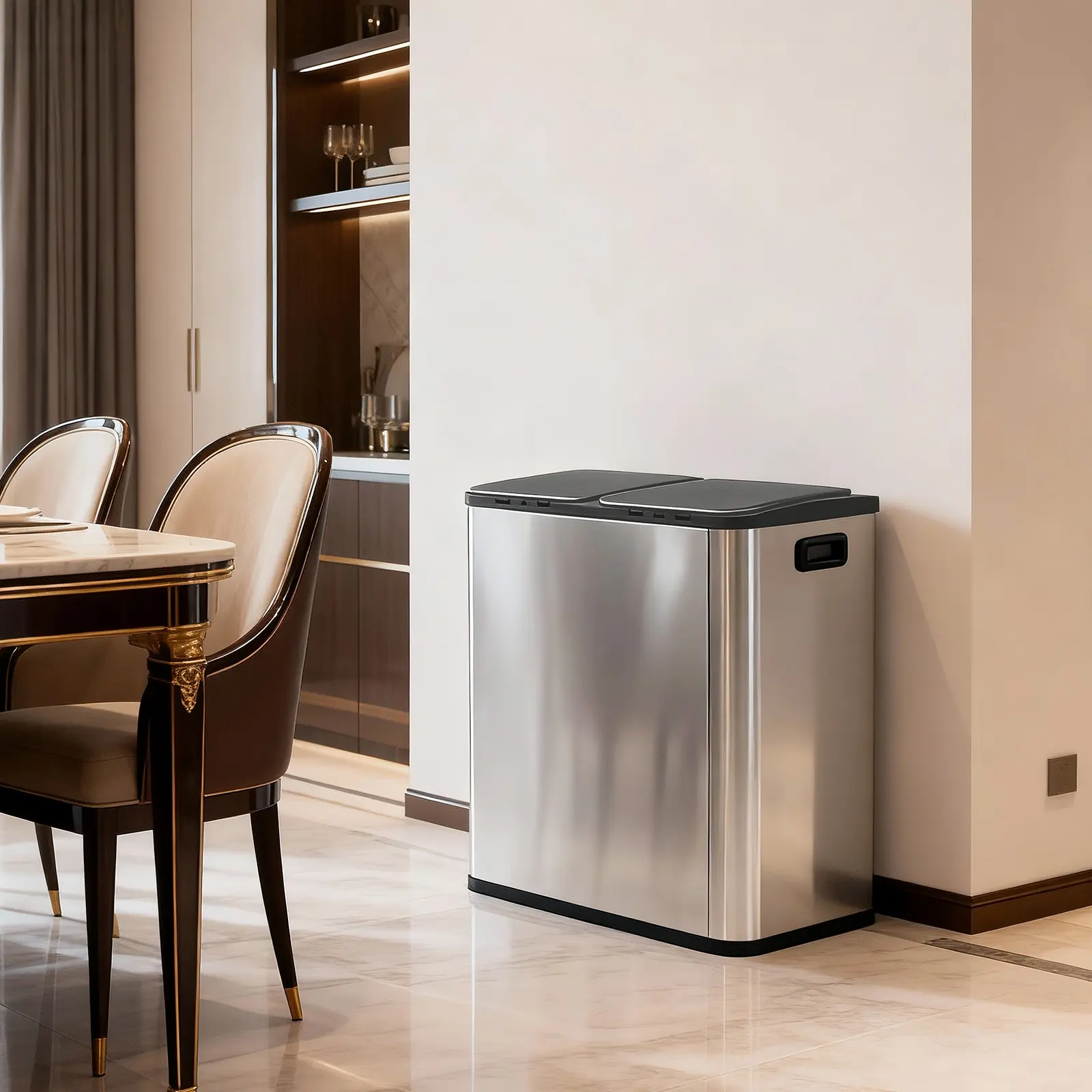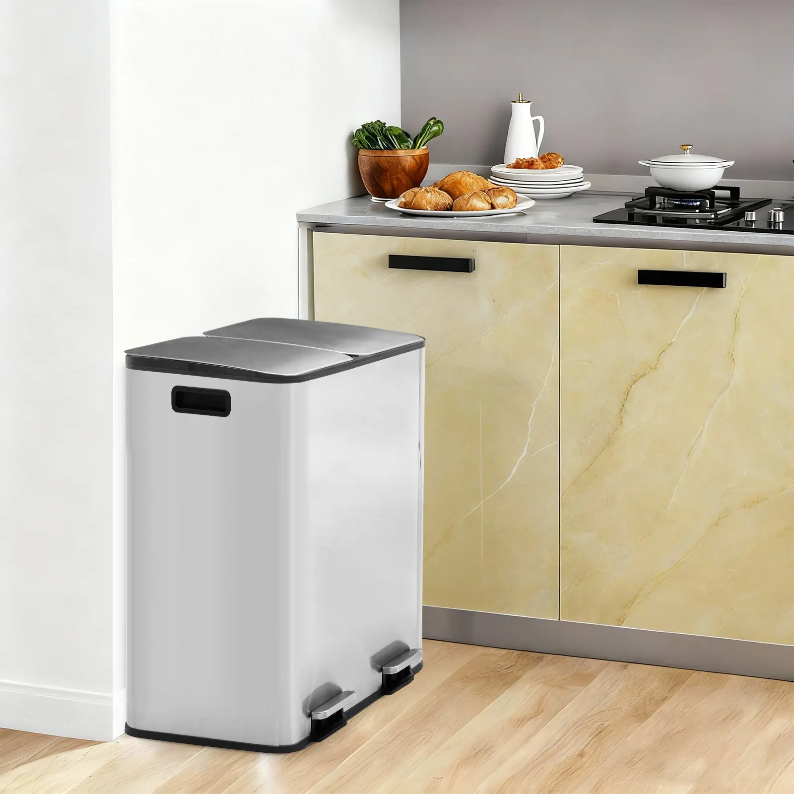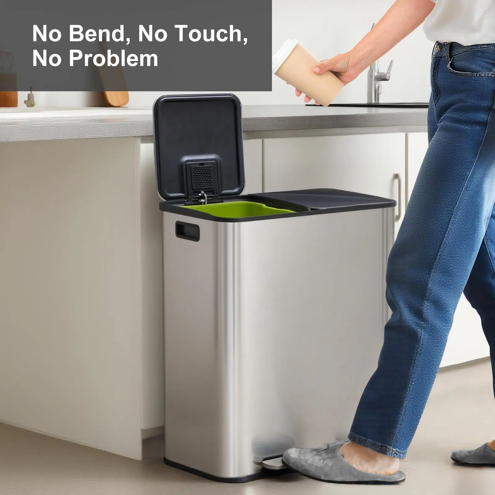 ·[Heavy-Duty Pedal]Double garbage bin features an industrial-grade steel foot pedal tested to withstand over 150,000+ steps and 300,000+open-close cycles, built for long-term home use. Its sleek profile fits seamlessly into any space: beside the kitchen island, in the bathroom, hallway, or home office.