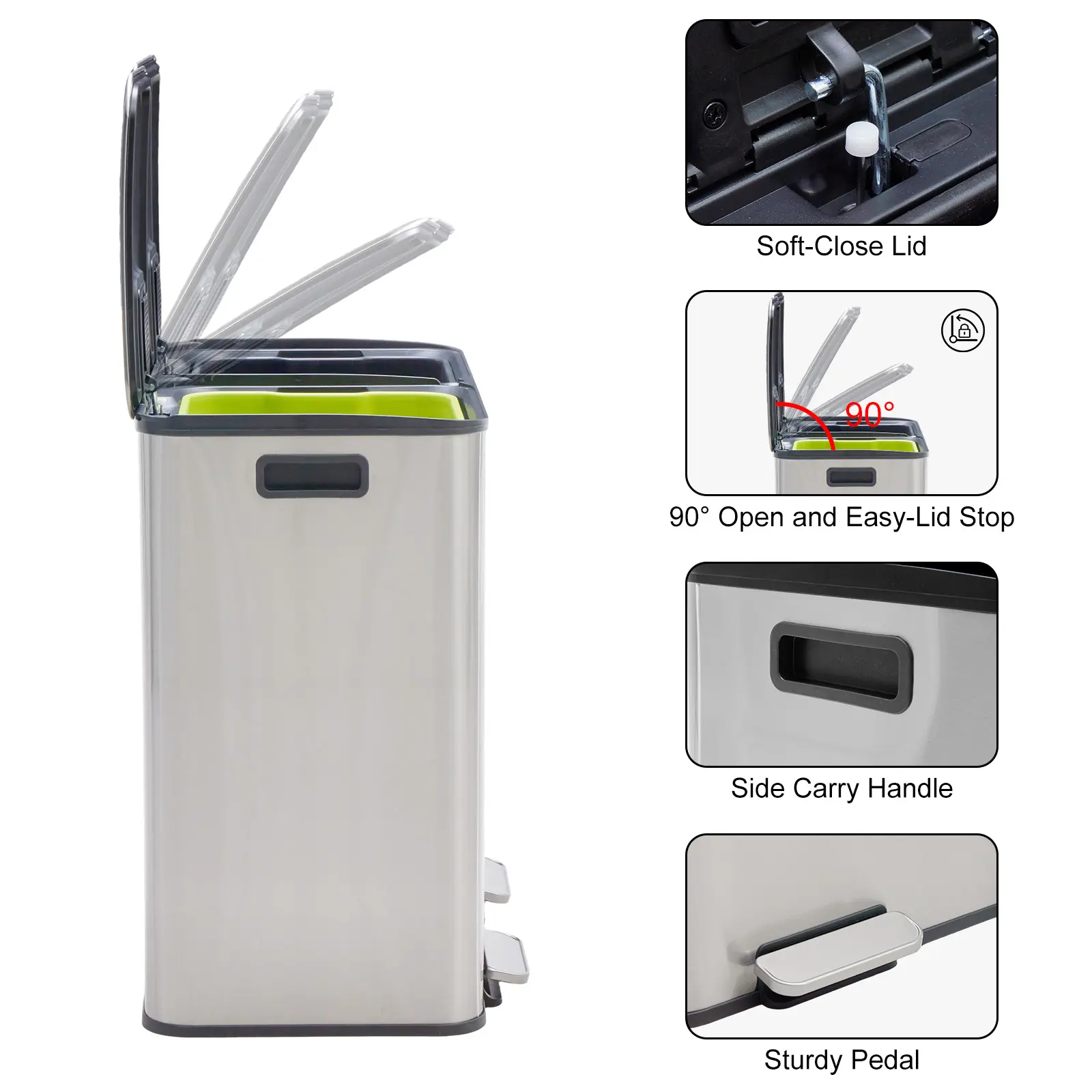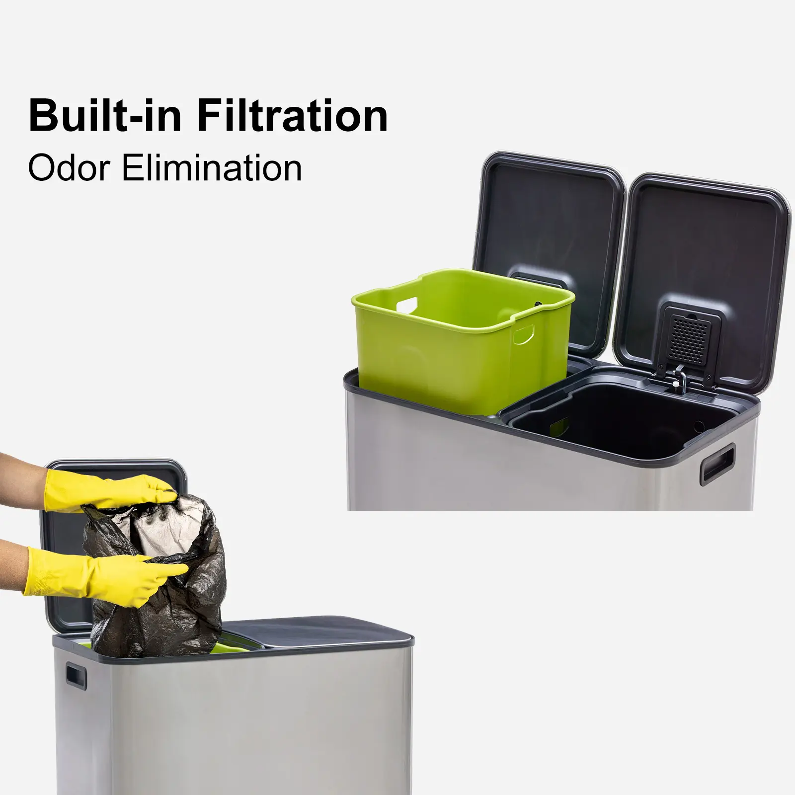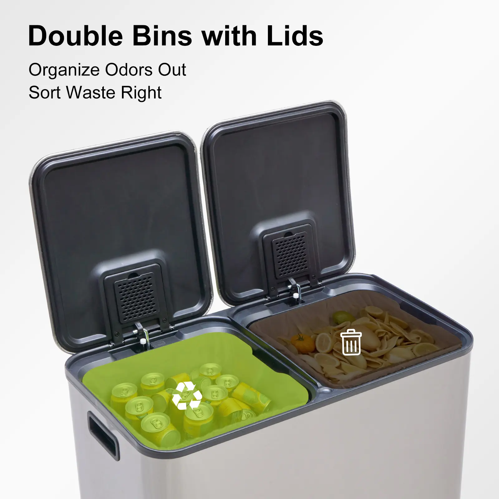 ·[Easy Sorting & Odor Control]Dual trash can includes two separate inner buckets make sorting trash and recycling simple and tidy.The sealed design of trash bin with lid effectively contains odors and helps keep pets from making a mess, supporting a cleaner and more organized living space.