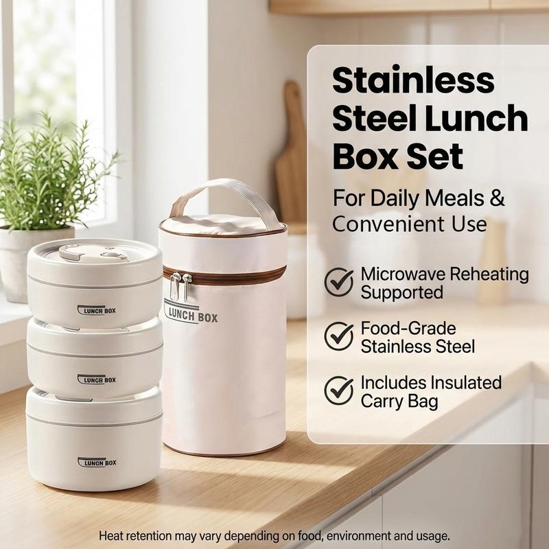 Ideal for daily use, this set includes 3 stainless steel lunch boxes and 1 insulated carrying bag. Designed for adults and kids, it is suitable for storing meals and reheating food before eating.