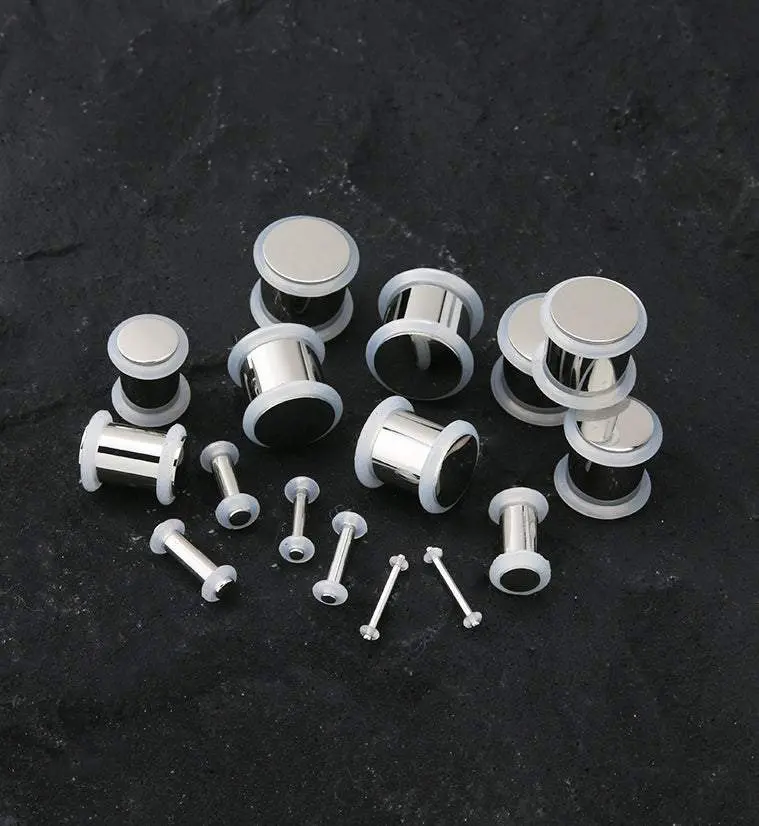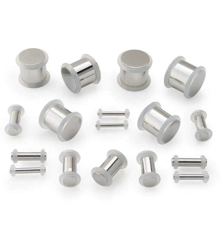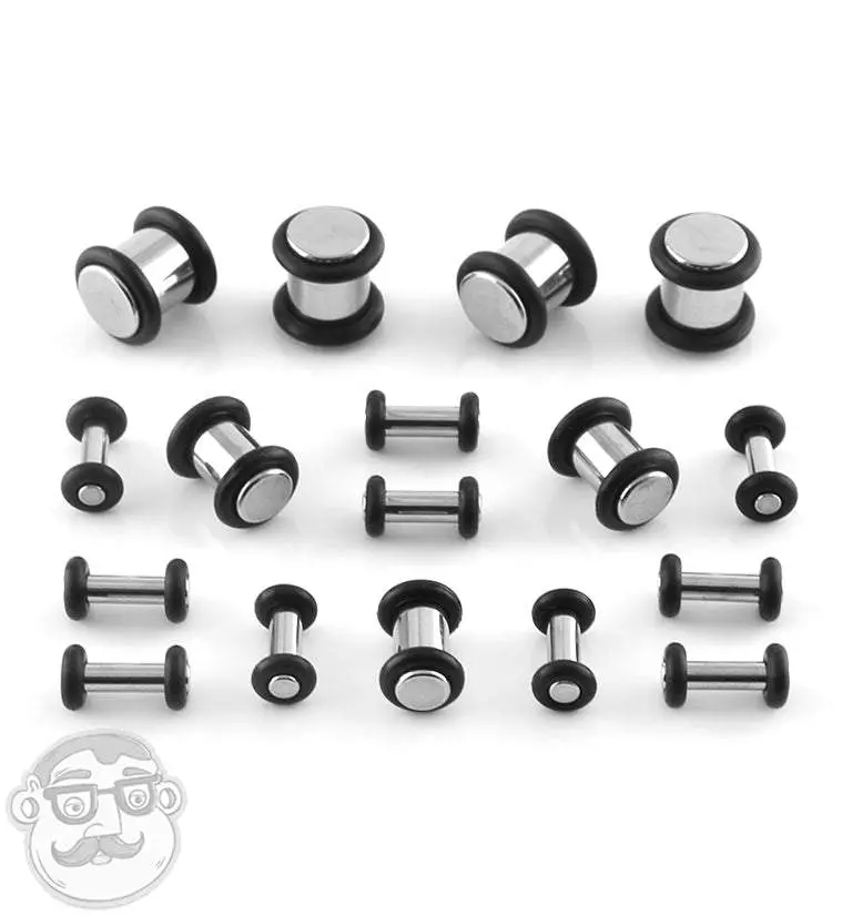 Simple stainless steel plugs with clear "O"rings to keep them in place. No flares. There are grooves on each end of the plug where the "O" rings sit. Made from high quality 316L stainless steel. 4 "O" rings included with a pair. Available in sizes: 16G (1.2mm) - 1/2" (12mm). Sold in pairs.