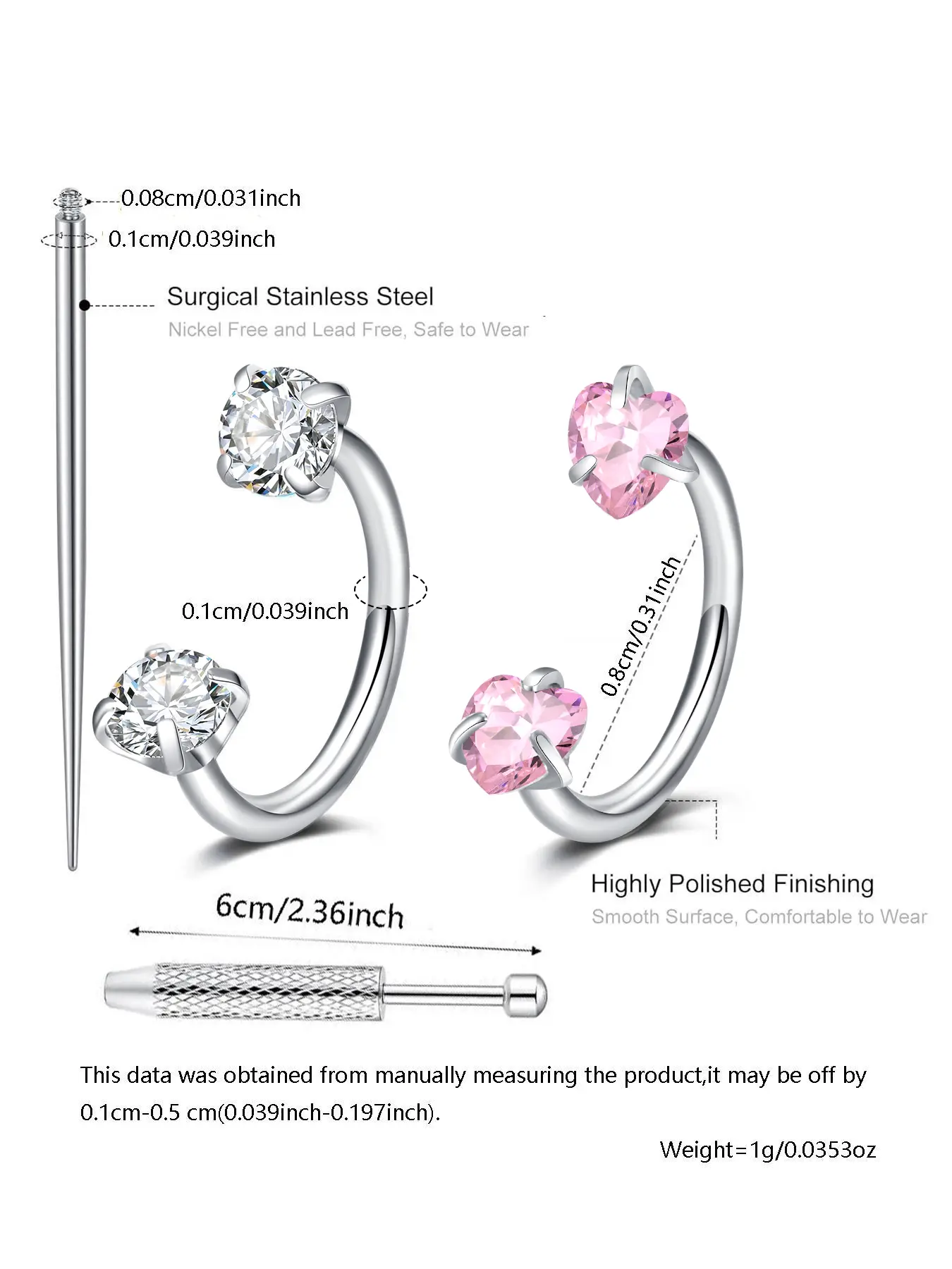 I love the nose rings. For anyone wanting to buy, they are slightly bigger than a normal size nose ring so I may be a little struggle to get it in, but the tool makes it easier to help to stretch the hole. But nothing major. The nose things are very, very nice and I will definitely purchase again