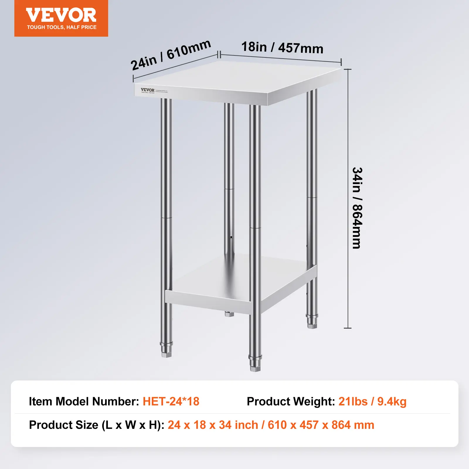 • High-Quality Stainless Steel: This work table, measuring 24 x 18 x 34 inch, is made from SUS201 stainless steel for the tabletop, shelves, and legs. It offers superior rust resistance, a sleek appearance, and a smooth surface that is easy to clean with a simple wipe. NSF certified, it meets strict public health standards, ensuring long-lasting protection for your health.