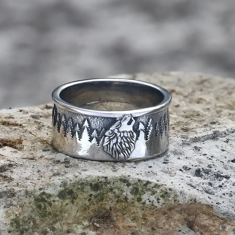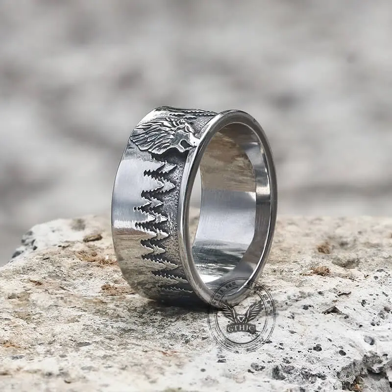 GTHIC Unisex Howling Lone Wolf Stainless Steel Ring Forest Pattern For Daily Wear Birthday Gift