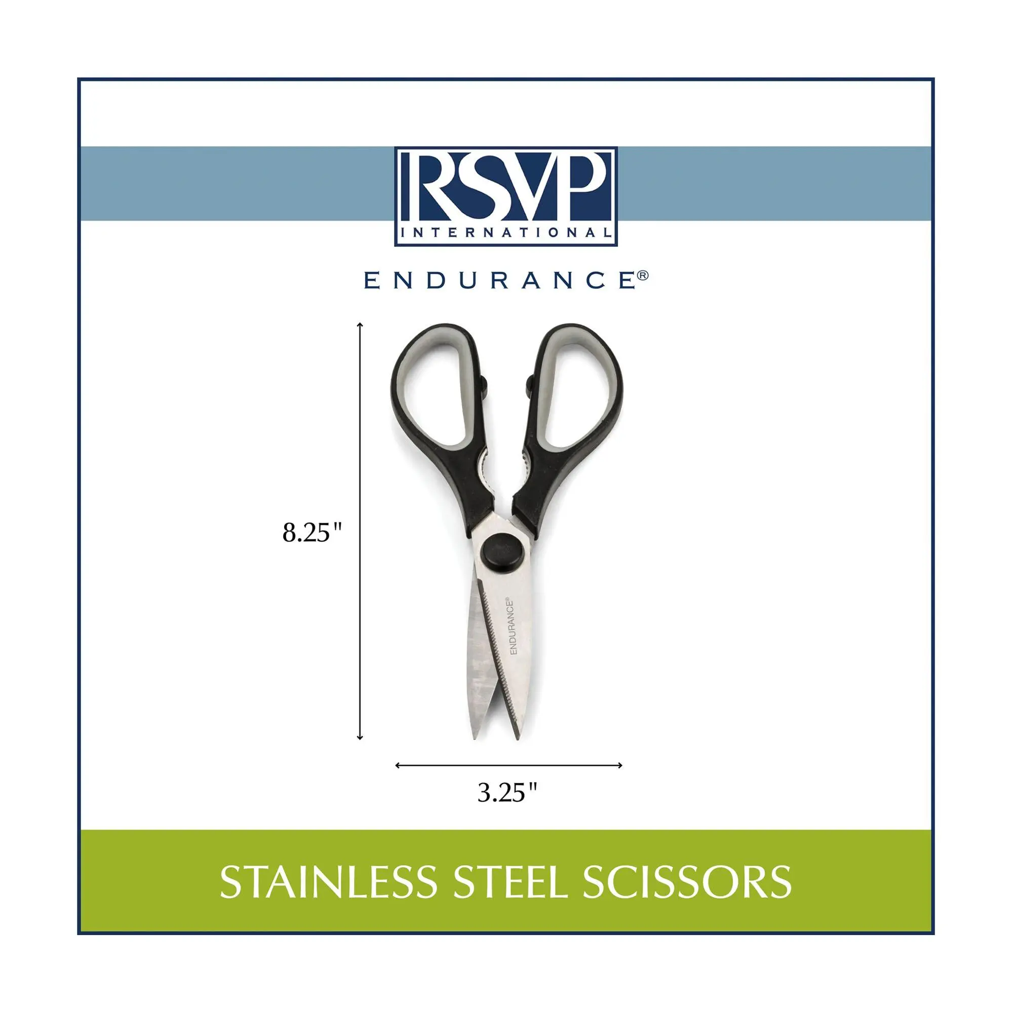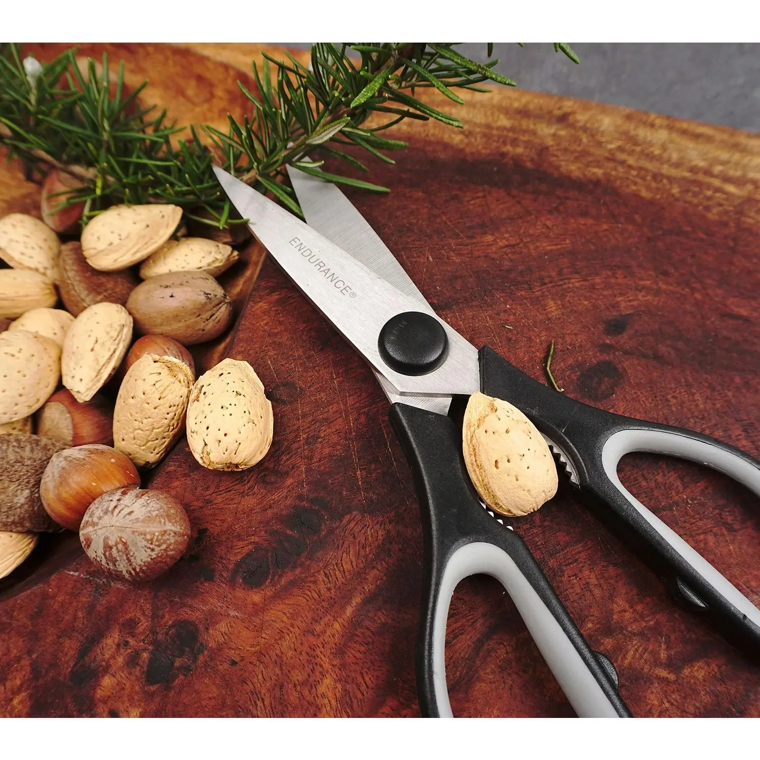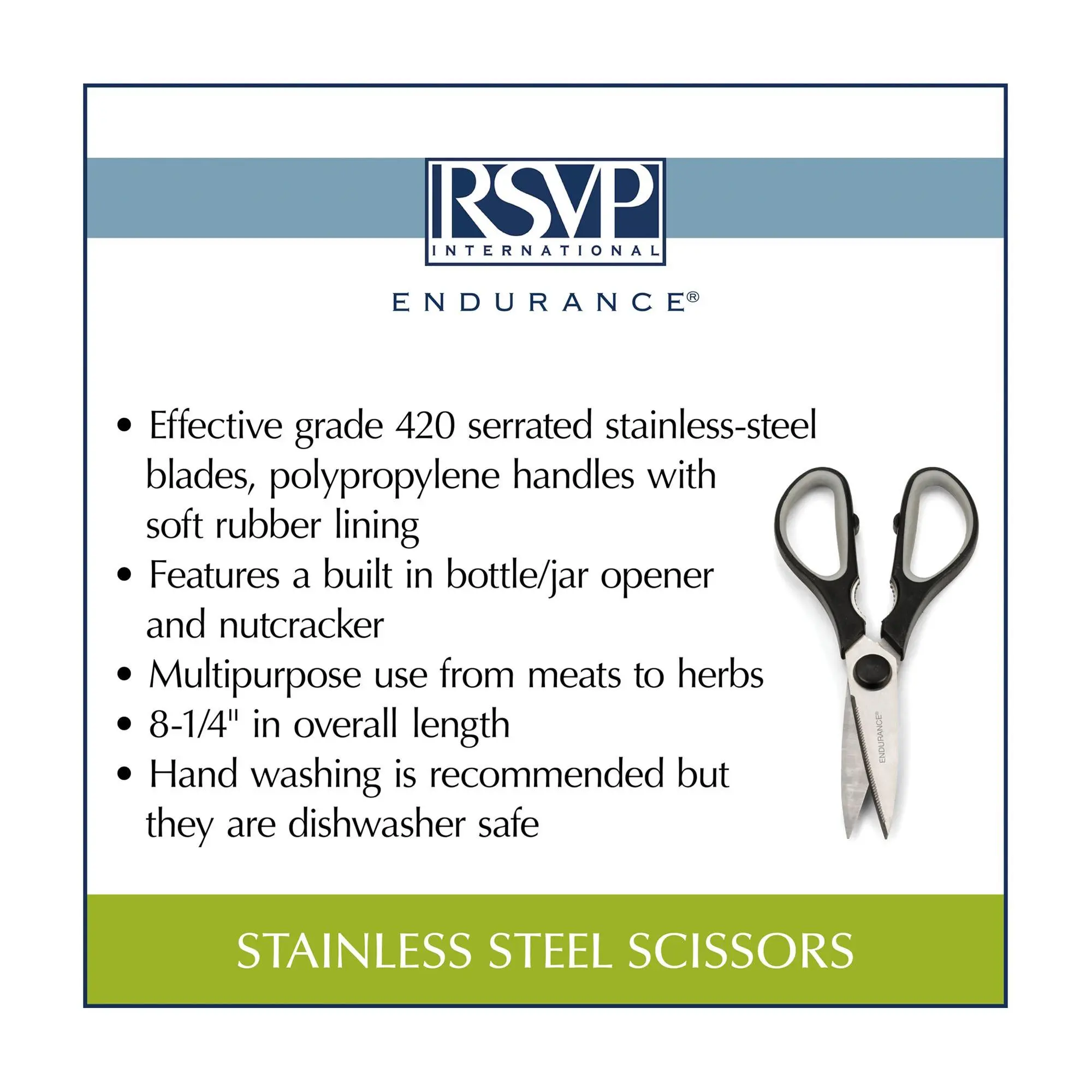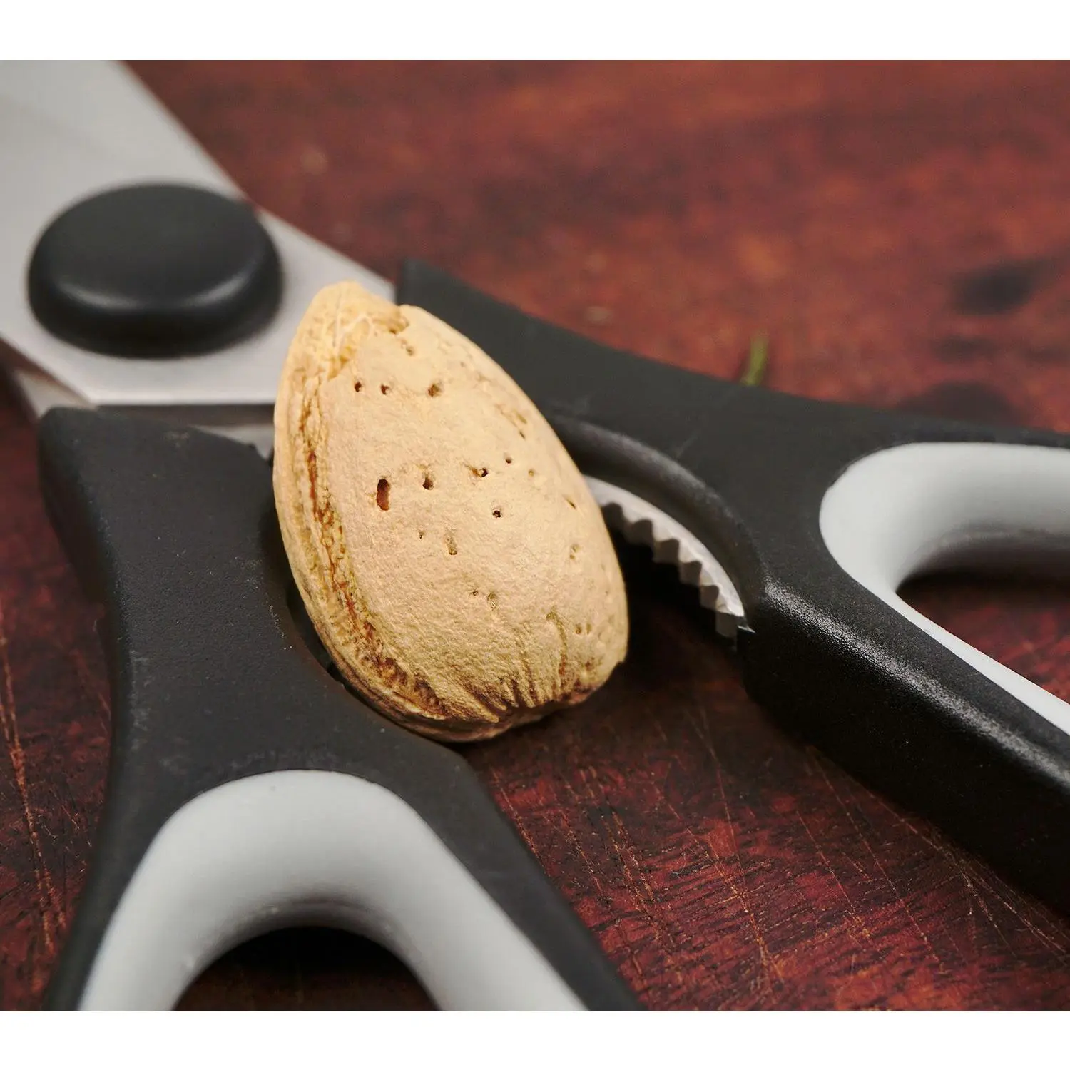 Effective grade 420 serrated stainless-steel blades and polypropylene handles with soft rubber lining. In addition to cutting, these scissors feature a built in bottle opener, nutcracker and jar opener. Use these scissors on everything from meats to herbs. Dishwaher safe, but hand washing is recommended. Measures: 8.25" x 3.25" x .50";Scissors