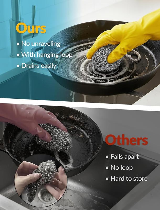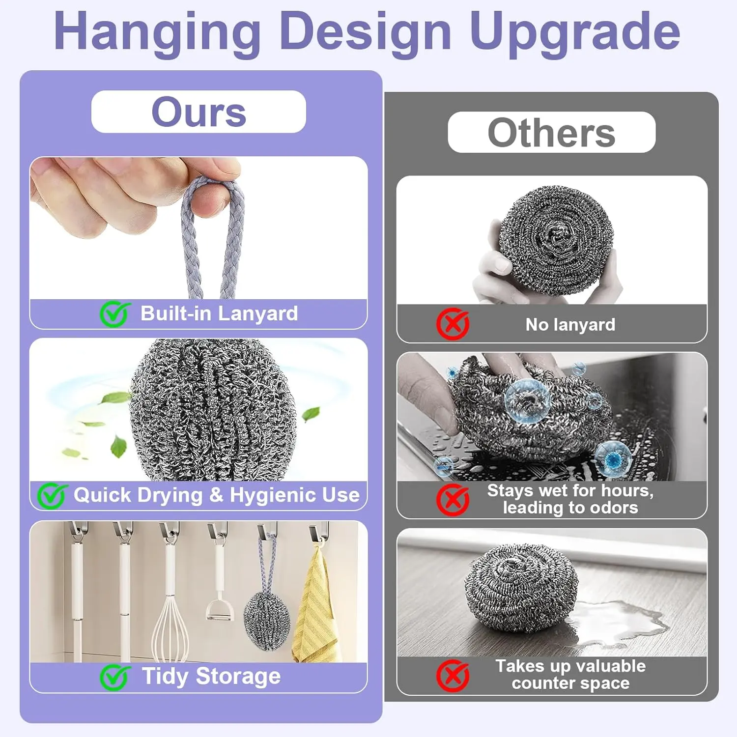 Convenient Hanging Design: Each steel wool scrubber features a built-in hanging string for quick drying and easy storage. Simply hang it on hooks or kitchen racks to prevent moisture buildup and extend the scrubber’s lifespan.