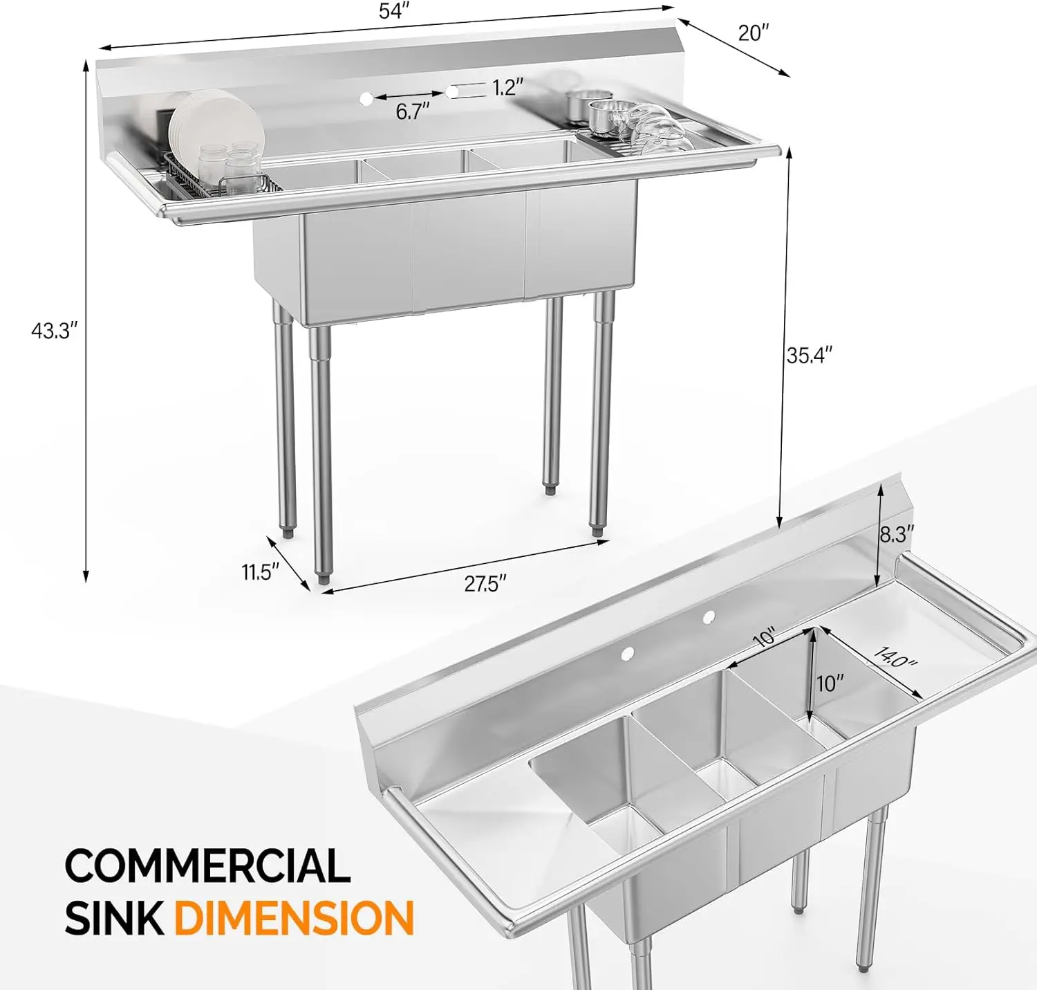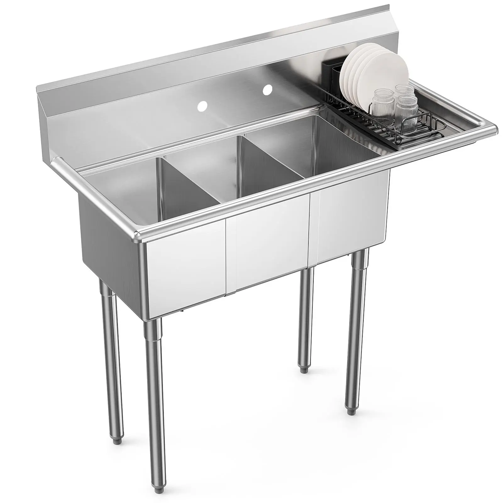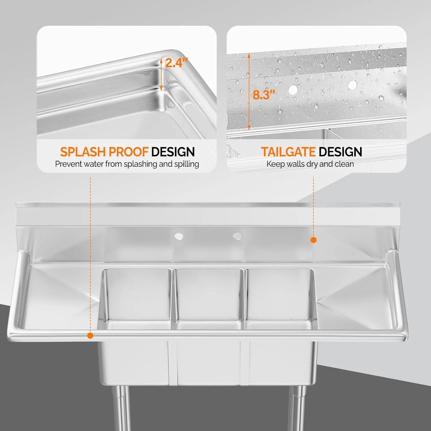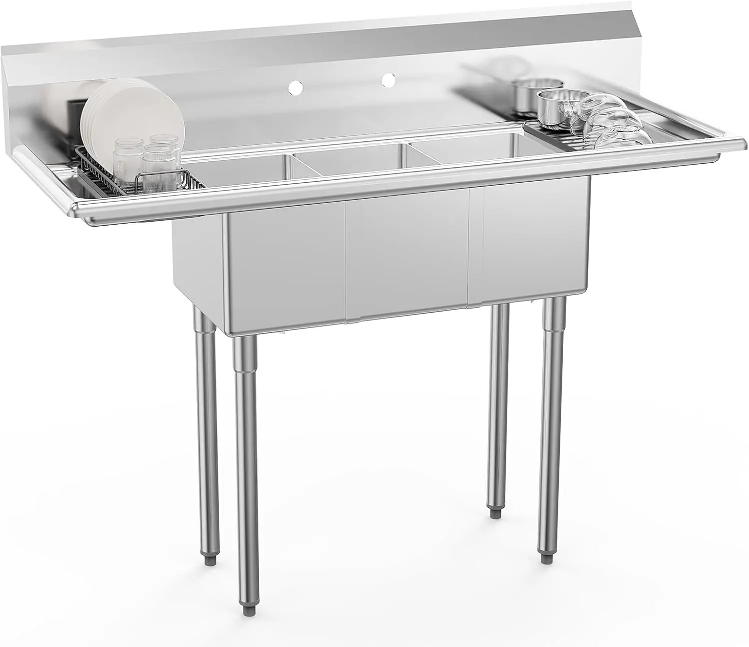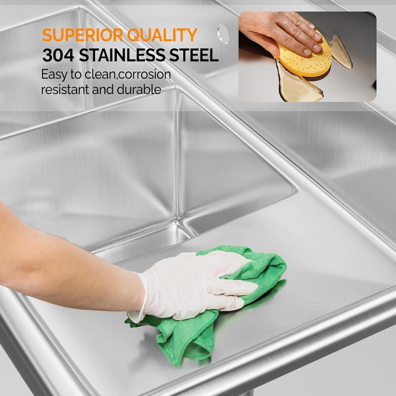 5. ROVSUN Commercial Sink, Stainless Steel Sink with 3 Compartment and 2 Sides Drain Rack, 20" x 54" x 43.5" Freestanding Utility Sink, Great for Restaurant Kitchen Laundry Room Garage Sunroom