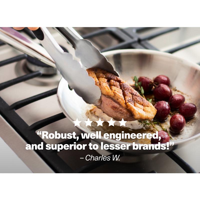 These are the best tongs I have ever used. They are heavy, solid, and extremely well made. All the edges are smooth including the inside of the handles which makes cleaning easy and prevents sponges from getting shredded when getting into the nooks and crannies. It is such a joy to turn the heftiest of steaks with these tongs which do not flex at all (as compared to the cheap sheet metal tongs from other brands). You will not regret adding these tongs to your kitchen tool arsenal.