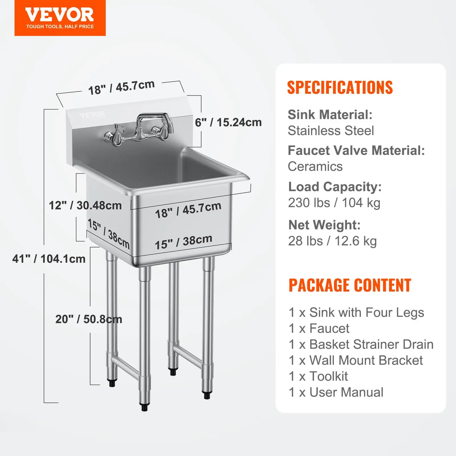 • All-Purpose Drainage Solution: This free standing utility sink comes with a premium stainless steel basket strainer and drain assembly that is corrosion-resistant and durable for long-term use. The filter is designed to catch food, preventing clogging in the pipeline. The sink also has a high backsplash that helps keep your walls and cabinets dry and prevents splashes.