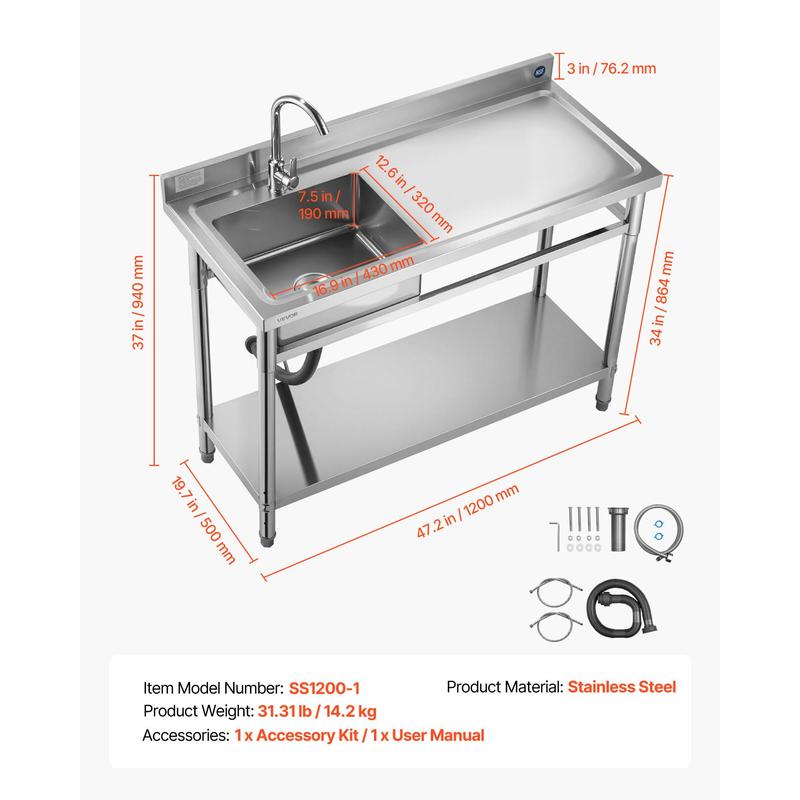 VEVOR Stainless Steel Utility Sink, Free Standing Single Bowl Commercial Kitchen Sink with Faucet, Utility Right Basin Workbench with Hot & Cold Water Pipe for Garage Restaurant Laundry, 47x19.7x37 in