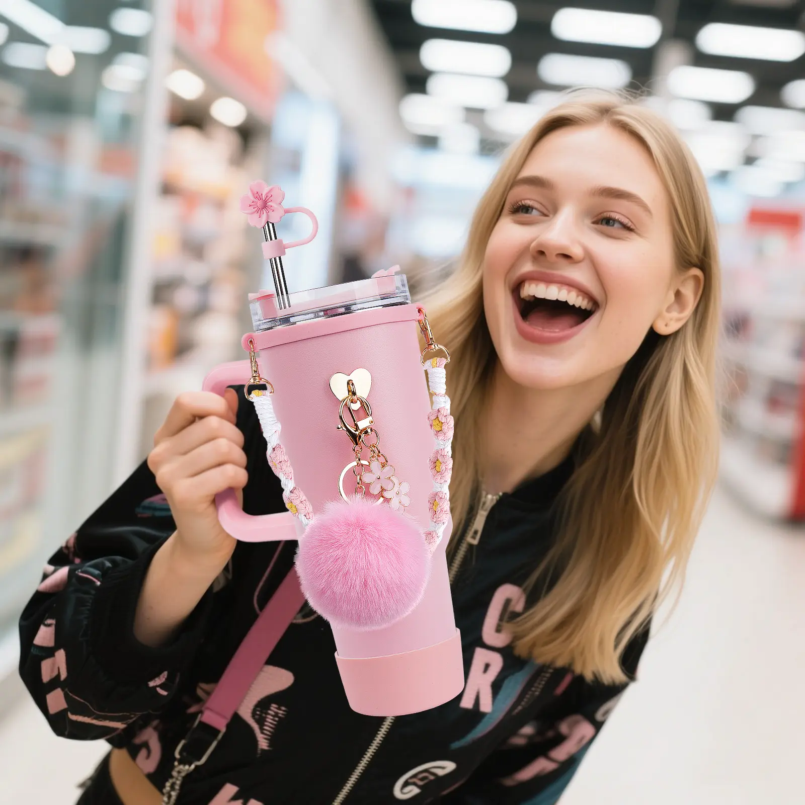 With a sleek and modern design, our cup comes with a convenient handle and a straw, making it a breeze to carry and sip from. The Bohemian - chic strap, elastic silicone ring, and charming pendant don't just add elegance; they transform it into a trendy fashion statement. It's a perfect companion for travel, sports, fitness sessions, or shopping sprees. Versatile enough to suit cups of any color, it effortlessly complements your unique style.
