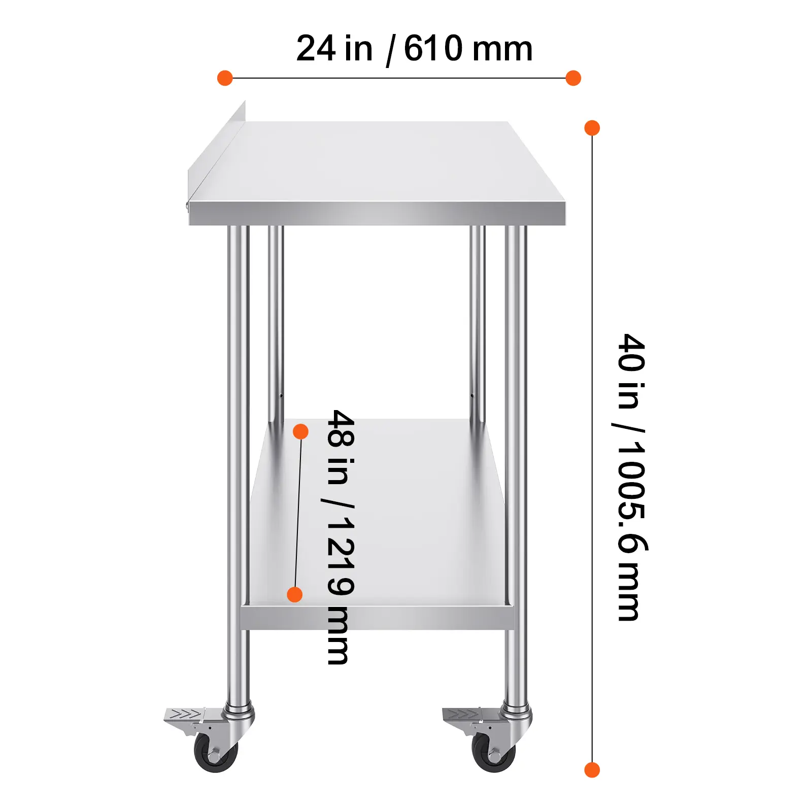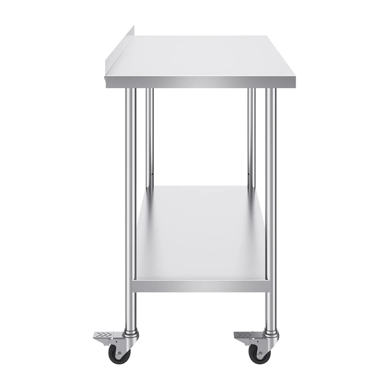 • User-Friendly Design: Featuring 3-level adjustable shelves, this work table offers the most user-friendly and practical functionality. Simply adjust the shelf height with screws to accommodate items of different sizes. Equipped with 4 swivel casters, including 2 with brakes, the table remains stable and can be easily moved to any location. The high rear backsplash prevents items from falling off and guards against water splashes.