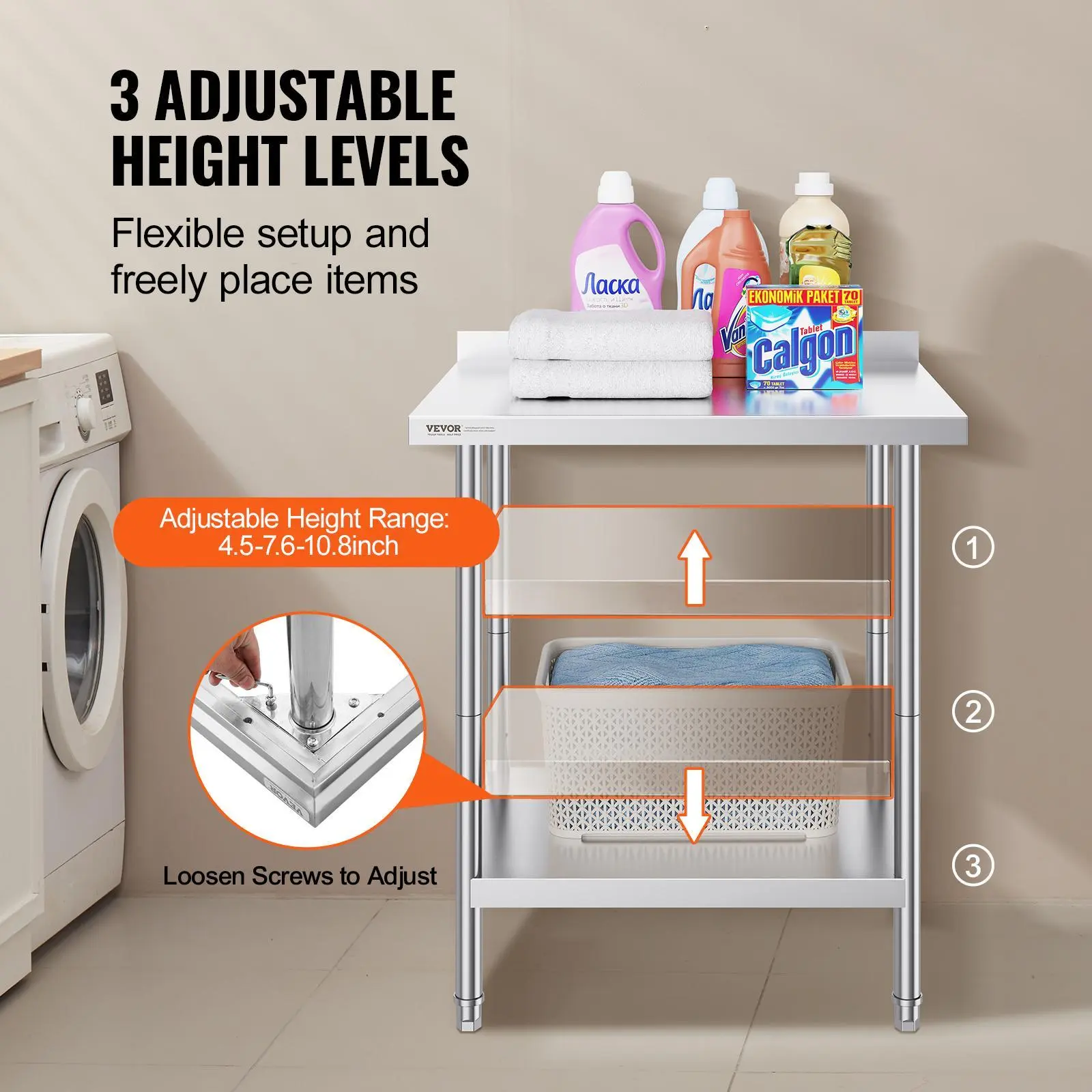 • User-Friendly Design: Featuring 3-level adjustable shelves, this work table offers the most user-friendly and practical functionality. Simply adjust the shelf height with screws to accommodate items of different sizes. The high rear backsplash prevents items from falling off and guards against water splashes.