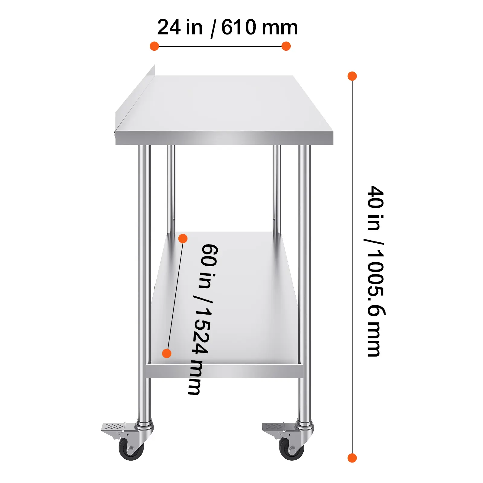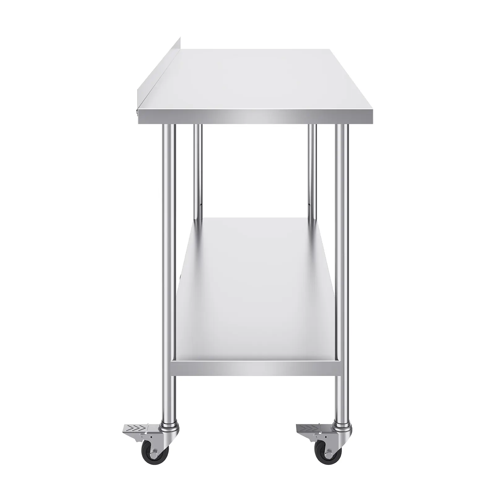 • User-Friendly Design: Featuring 3-level adjustable shelves, this work table offers the most user-friendly and practical functionality. Simply adjust the shelf height with screws to accommodate items of different sizes. Equipped with 4 swivel casters, including 2 with brakes, the table remains stable and can be easily moved to any location. The high rear backsplash prevents items from falling off and guards against water splashes.
