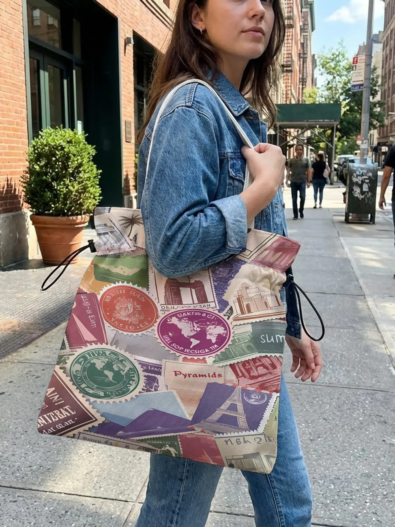 Stamp Pattern 2D Printed Drawstring Tote Bag, Large Capacity Shopping Bag, Commuter Tote Bag, Durable and Wear-Resistant, Random Print, All Seasons