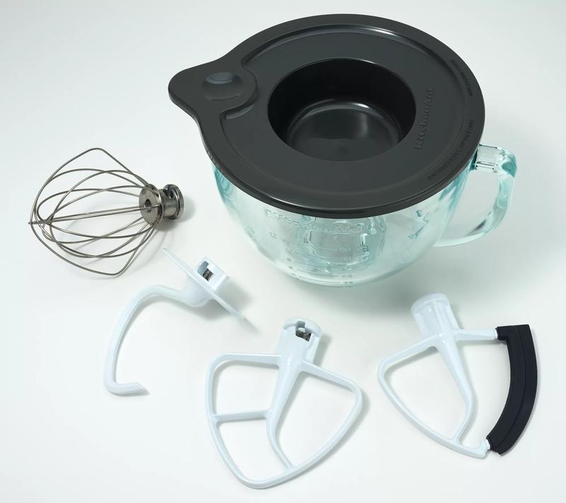 ·Includes KSM154GBQ4 stand mixer, 5-qt glass bowl with spout and handle, bowl lid, coated dough hook, coated flat beater, stainless steel wire whip, and Flex Edge beater
