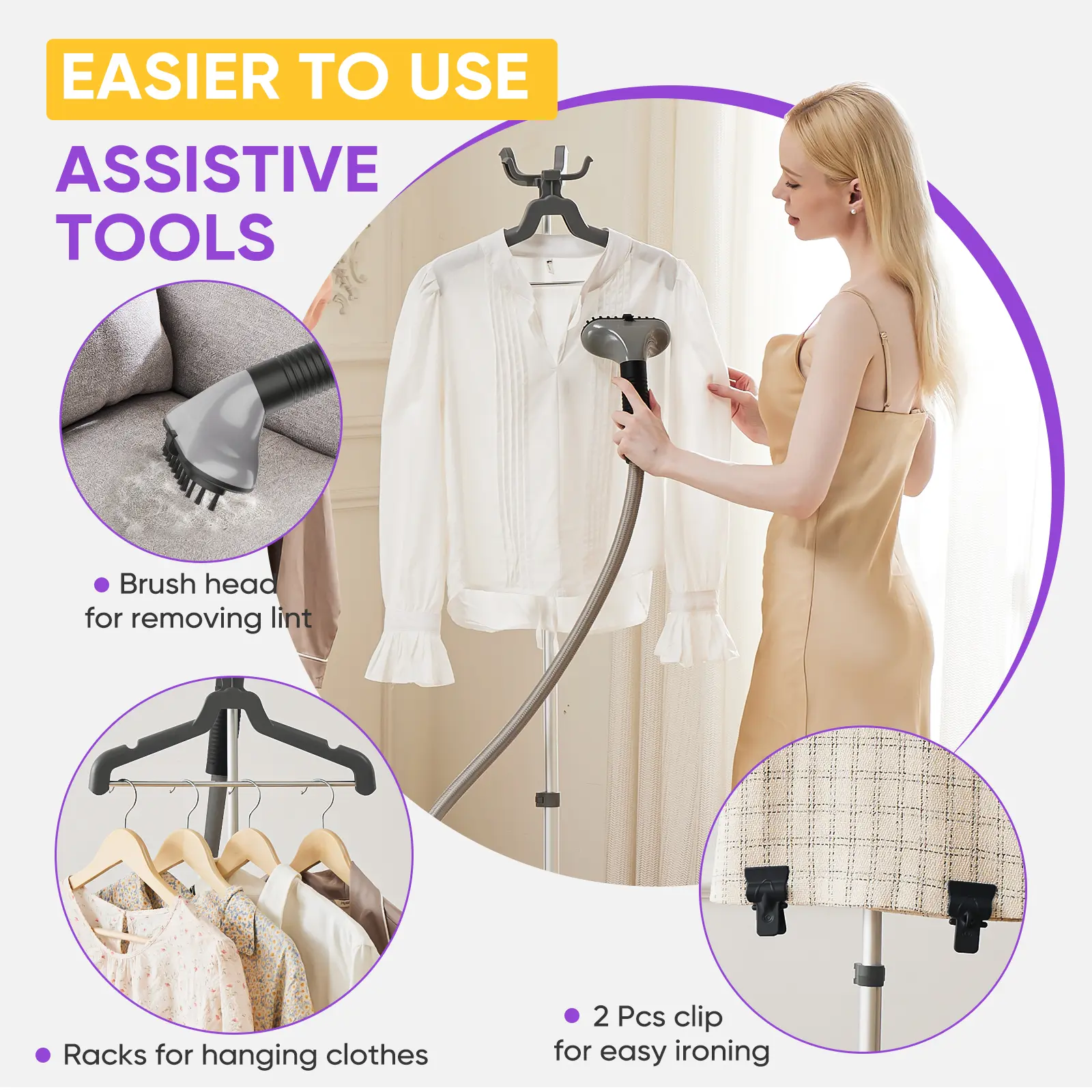·ADJUSTABLE HEIGHT: Our steam iron includes 3 sections of telescopic hose that can be adjusted to different heights for easier use. It also comes with 2 clips that can be used to hang clothes and help remove wrinkles effectively.
