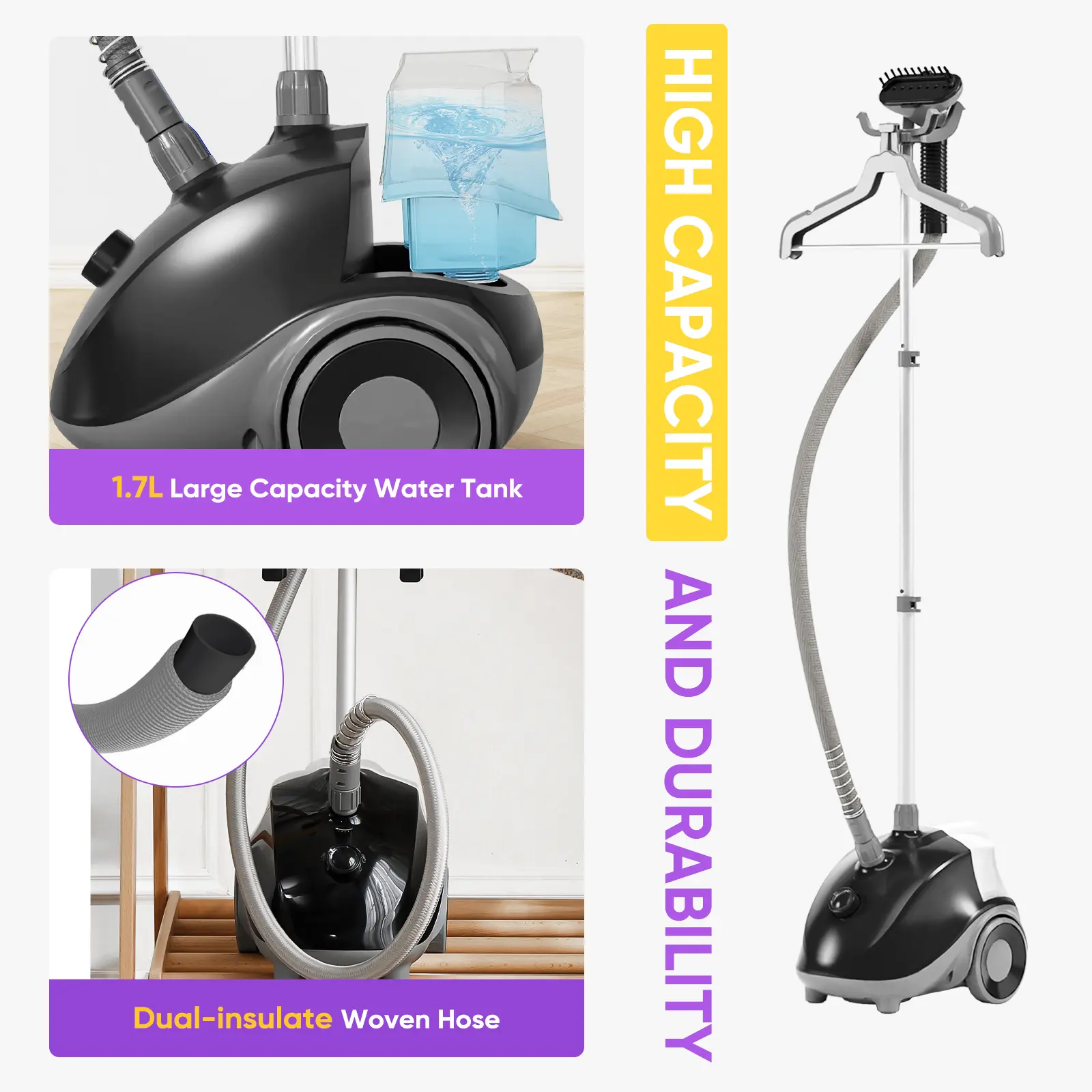 ·1500W HIGH EFFICIENCY:The 1500-watt efficiency vertical garment steamer heats up in just 45 seconds and provides 55 minutes of continuous wrinkle-removing steam. Steam temperatures up to 131°F penetrate deep into clothing, draperies, upholstery and more, softening fibers and smoothing wrinkles. Say goodbye to wrinkles and have crisp, clean fabrics!