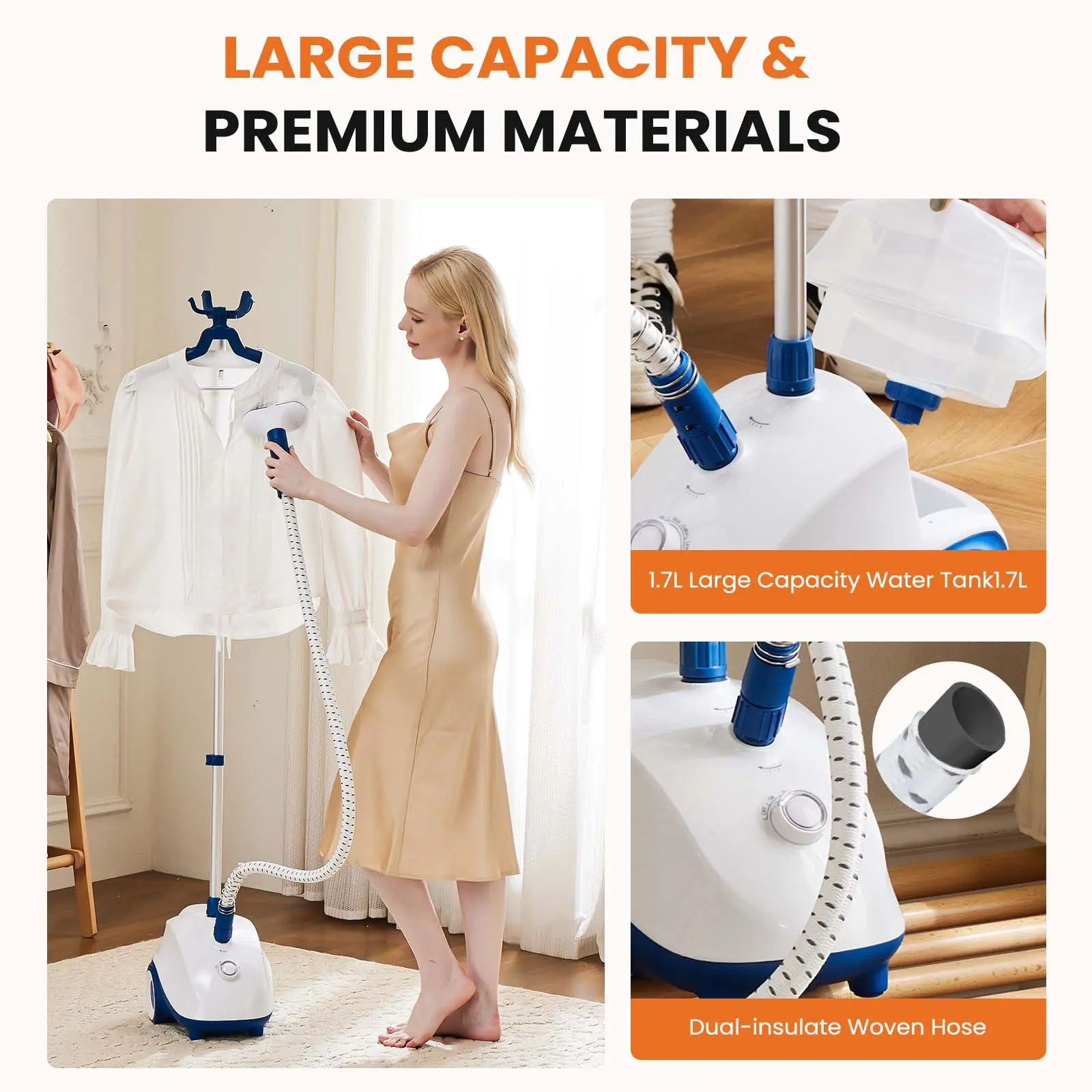 ·EXTENDED USAGE & AUTOMATIC SHUTOFF:Our clothes steamer features a dual safety protection system that automatically shuts off when the device overheats or runs out of water, ensuring your safety. With a large 1.7L water tank, you can enjoy up to 55 minutes of continuous steam to effortlessly refresh your clothes and garments.