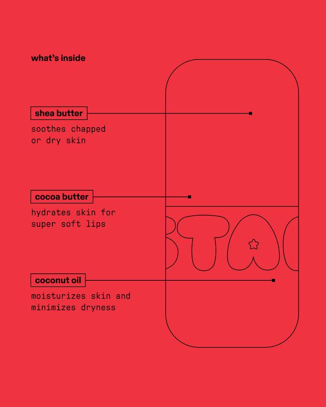 Star balm delivers long-lasting hydration with the help of shea butter, cocoa butter, and coconut oil—a powerful combo that keeps lips smooth and moisturized. Like a hug for your lips, these silky lip balms are here to help soothe chapped skin and minimize dryness.