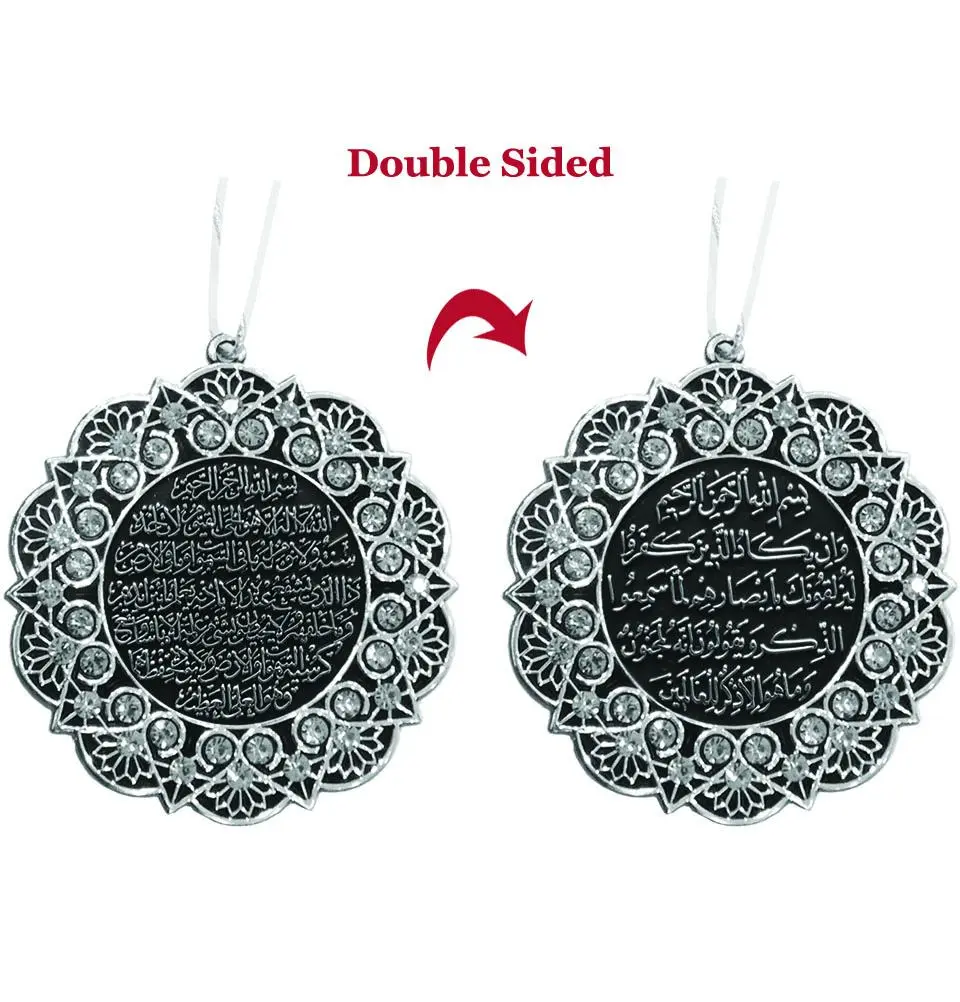 Double-Sided Star Car Hanger Ayatul Kursi & Nazar Dua - Silver/White A unique addition to our home decor line! This star shaped, double sided car hanger features Ayatul Kursi and Nazar Dua in intricate Arabic calligraphy. The rhinestones embedded throughout are an exquisite final touch, making this piece the perfect car accessory! Available in several awesome colors! Material: Plastic Diameter: 7cm (2.75in) Cord length of each may differ slightly; varies between 6 inches (15cm) and 9 inches (23cm) Made in Turkey