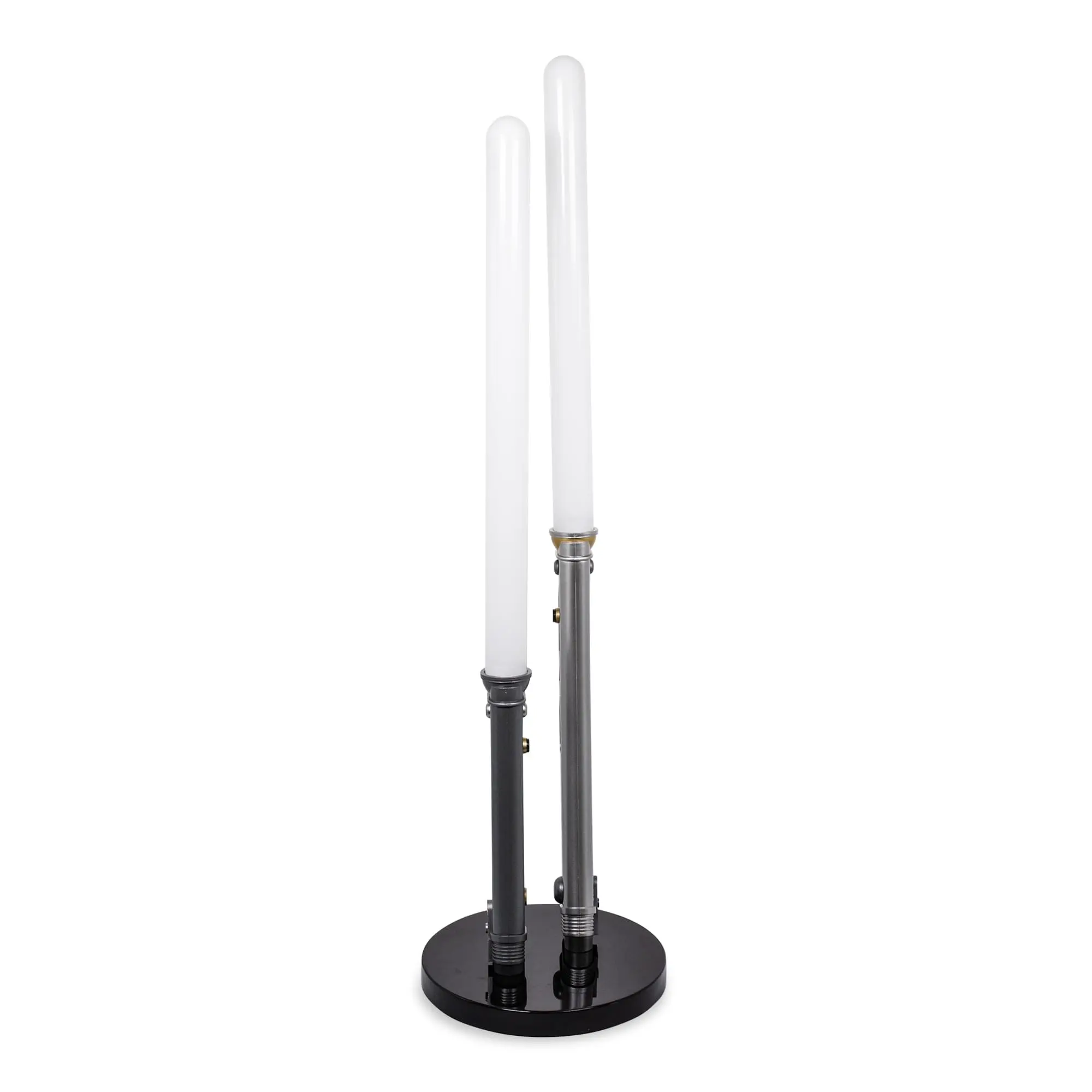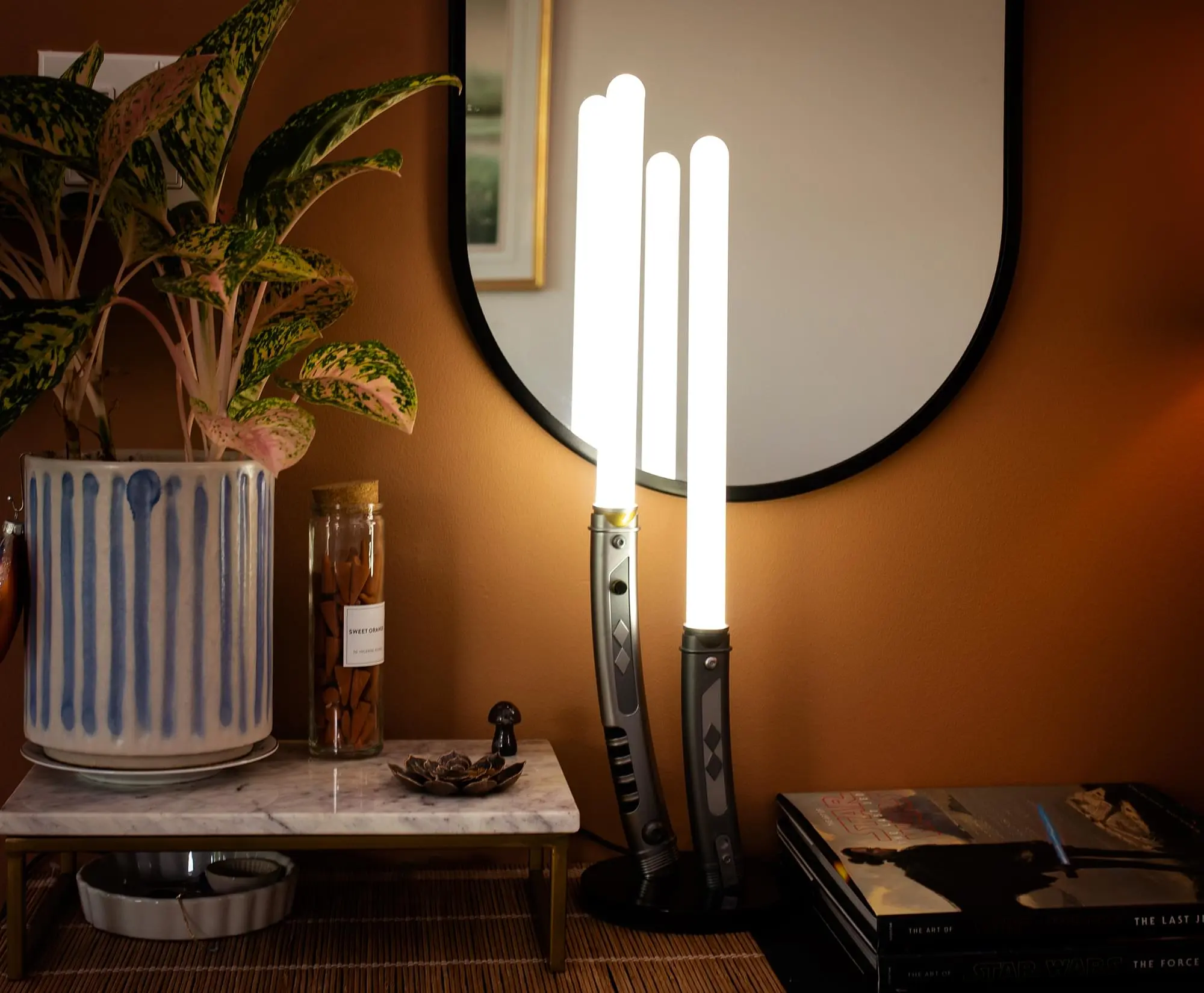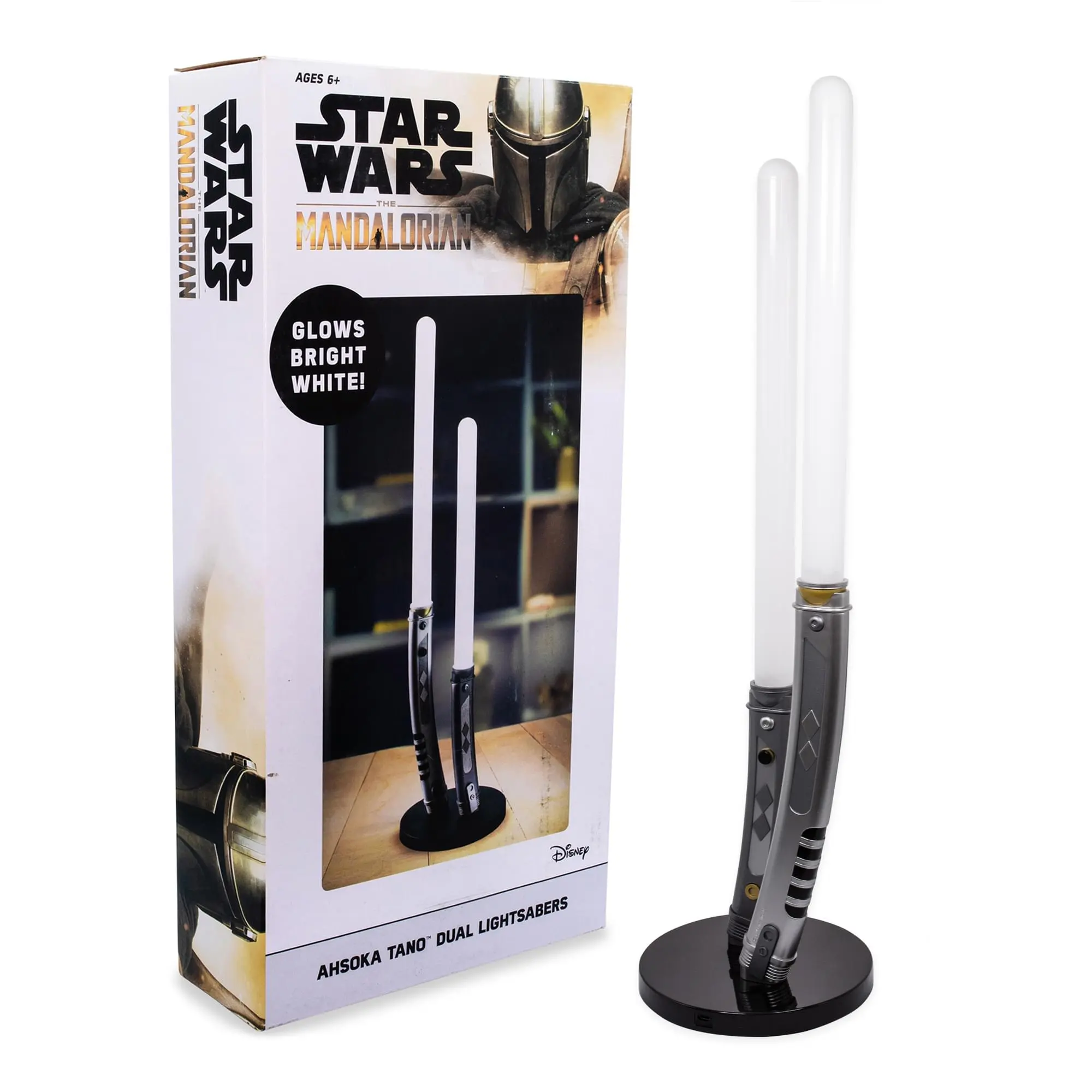 Standing almost 2 feet tall, this Star Wars Ahsoka Tano's Dual Lightsabers Table Lamp is modeled after the shoto-style lightsabers Anakin Skywalker's padawan wields in the era of the Disney+ series Star Wars: The Mandalorian. The look of her distinctive white blades is achieved with energy-efficient long-lasting LED bulbs. USB-powered, this lamp looks great plugged into your computer and displayed on your desk or in any power outlet provided you have a USB adapter. With her new solo series, Ahsoka Tano's lightsaber lamp is a fun addition to any Star Wars fan's collection.