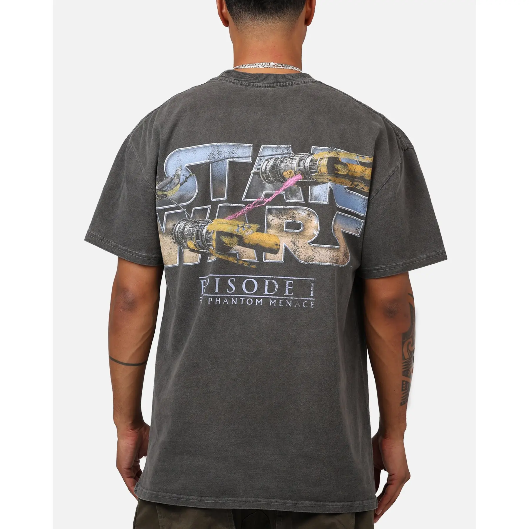 Relive the beginning of the Star Wars saga with the incredibly cool Star Wars Episode I Heavyweight Vintage T-Shirt. The custom-printed graphics on the front and back of the soft cotton tee are pulled straight from one of the most iconic scenes of the series. The ribbed crewneck and dropped shoulders give you a flattering fit that you're sure to love. With this piece, you can feel like little Anakin Skywalker himself. Get yours today from Culture Kings before they sell out.