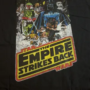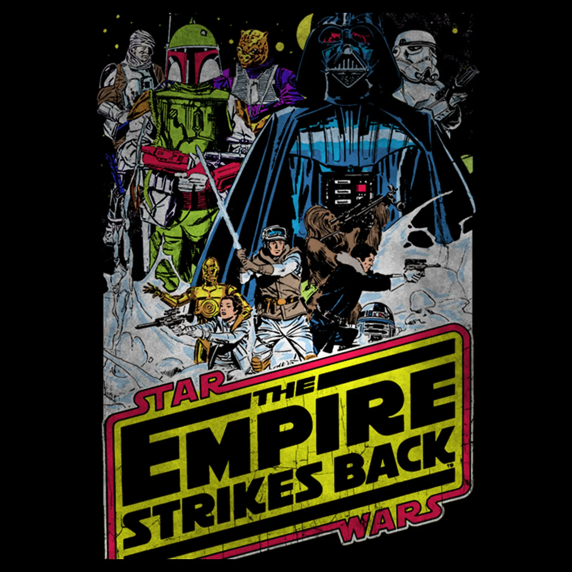 Celebrate the second film from the original Star Wars trilogy with the Star Wars Empire Strikes Back Black T-Shirt. Some of your favorite Star Wars characters such as Darth Vader, Boba Fett, and Chewbacca are printed with scenes from the planet Hoth above the Empire Strikes Back logo on a black Star Wars t-shirt.