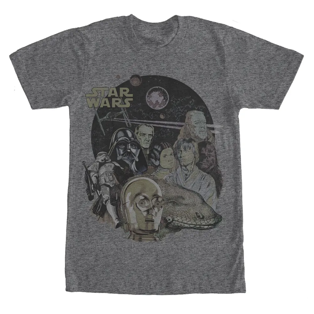 Next time you cruise the deserts of Tatooine, make sure you bring the Star Wars Characters and Sandtrooper Heather Charcoal T-Shirt. Darth Vader, Obi-Wan Kenobi, Princess Leia, Luke Skywalker, Chewbacca, C-3PO, and a Sandtrooper riding a dewback gather together in a vintage-style print on the front of this dark gray Star Wars shirt.