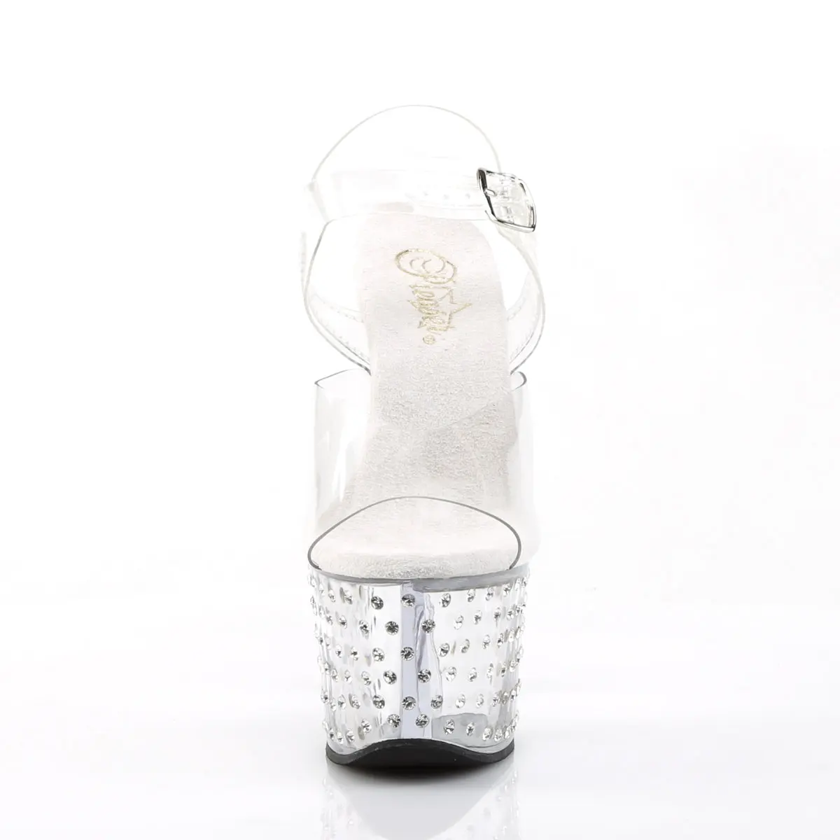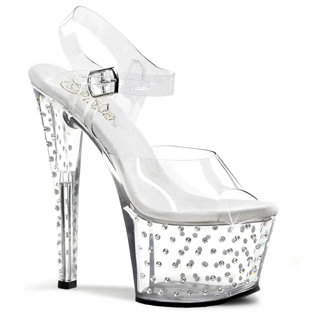 Step into the spotlight with the Stardust-708 Ankle Strap Sandals. These sandals feature a dazzling 7-inch heel and a 2 3/4-inch platform, both adorned with sparkling rhinestones that catch the light with every move. The clear straps add a touch of elegance and subtlety, making them perfect for any occasion where you want to shine. Ideal for performances, events, or a glamorous night out, the Stardust-708 creates a striking impression.