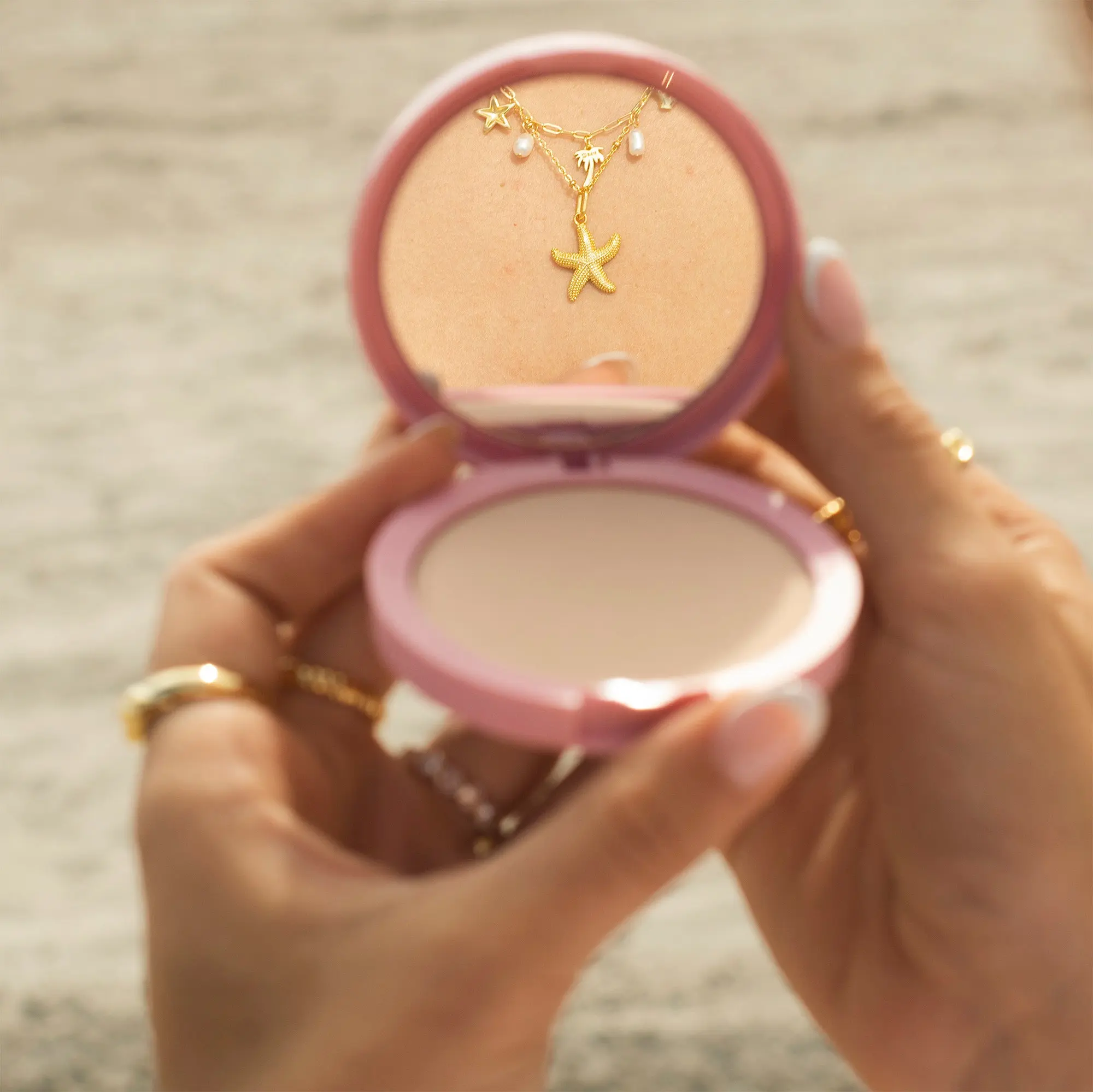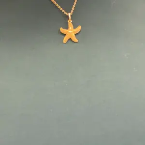The starfish necklace looks so cute. I wear it all the time as a stack and it stays perfectly gold. I love it so much.