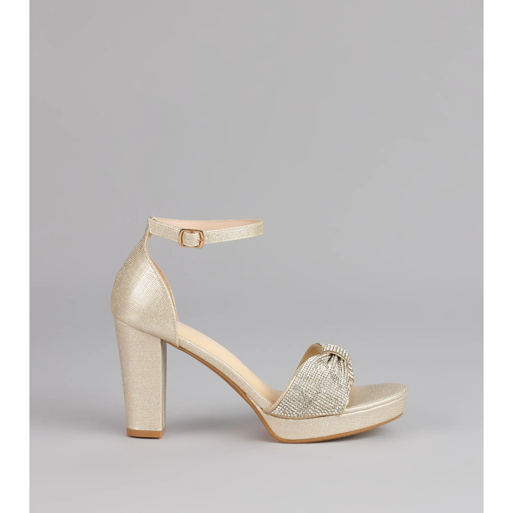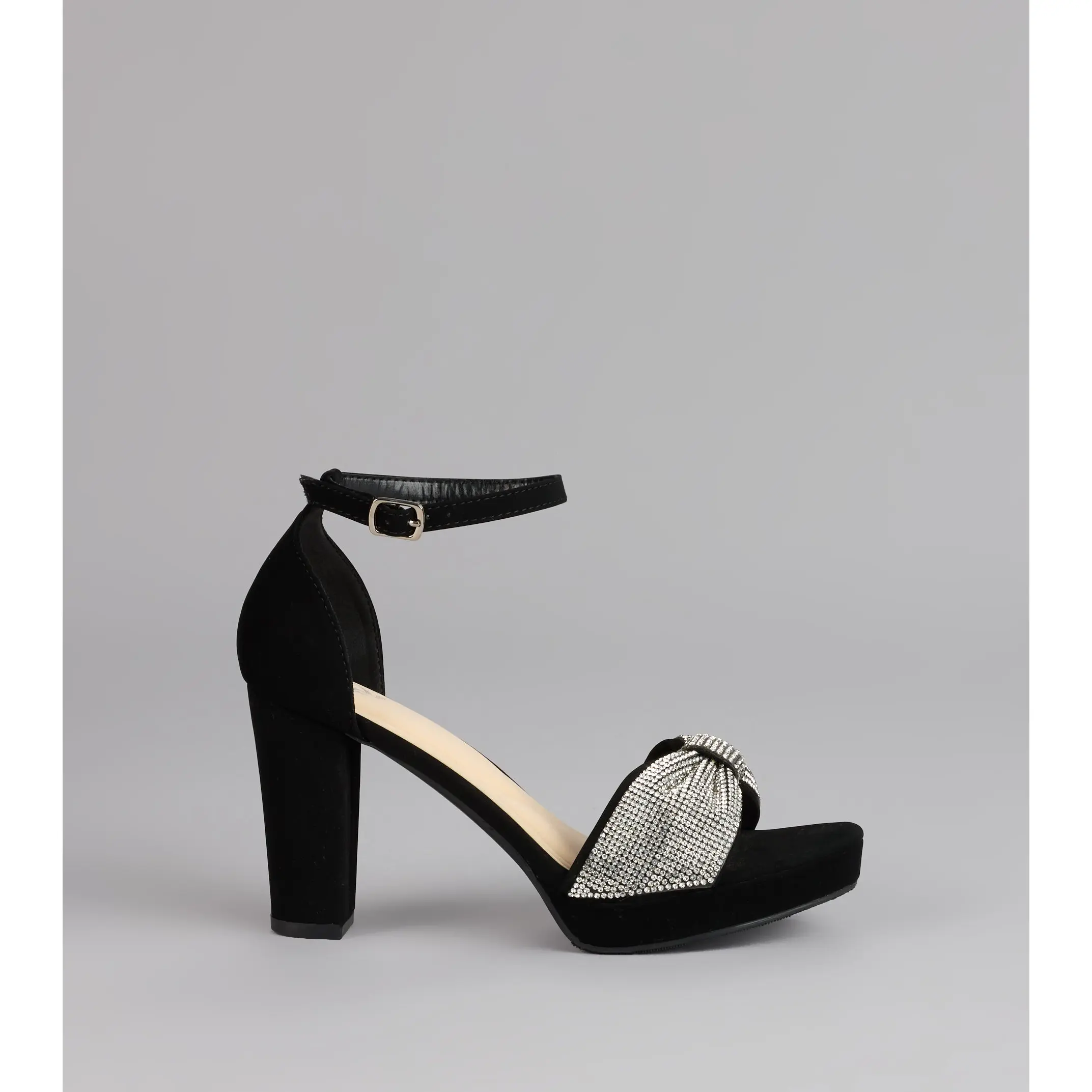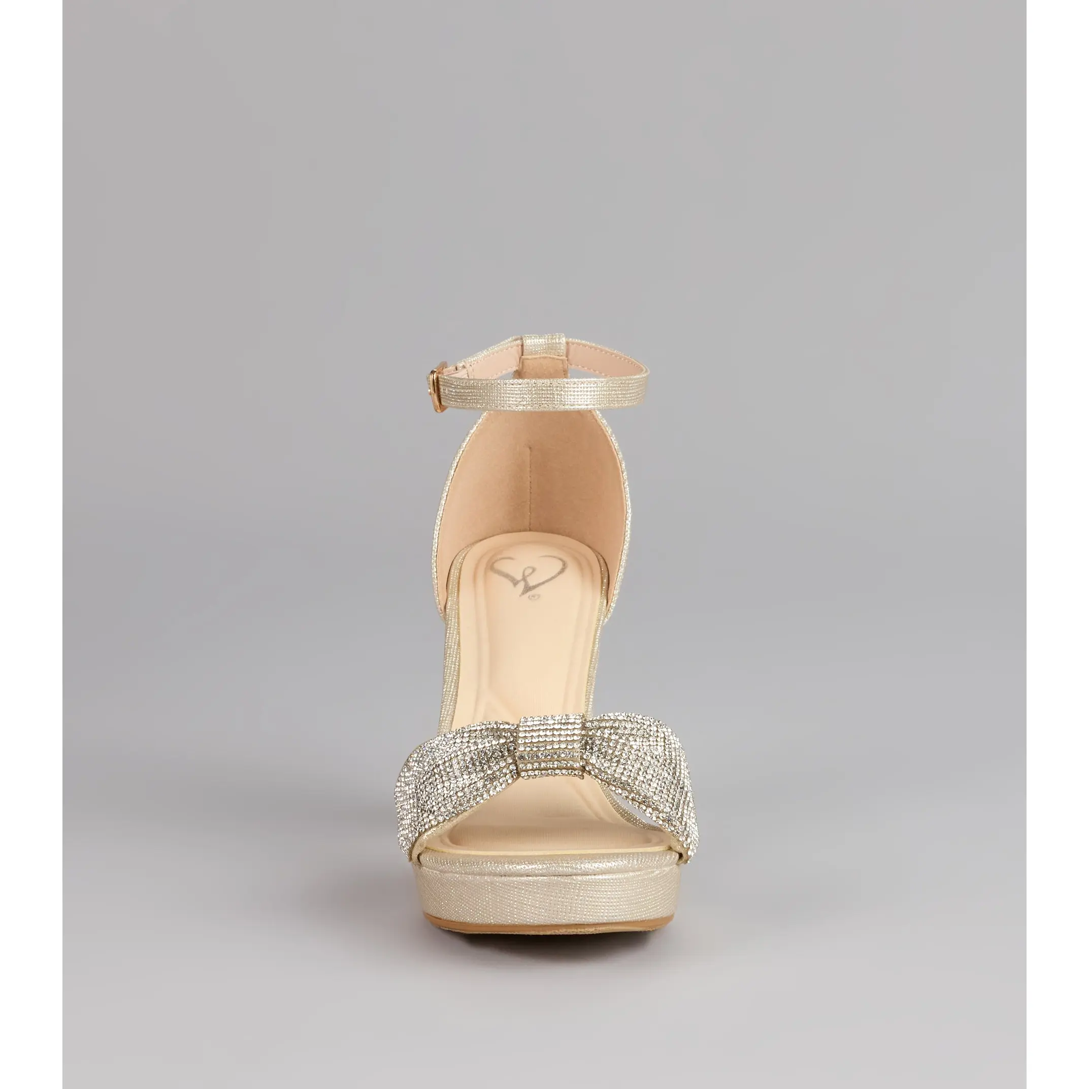These heels are here for your grand entrance—glitter mesh, a rhinestone bow strap, and a chic almond toe all wrapped into a sky-high block platform. They bring that playful, ultra-glam vibe that turns every step into a moment.