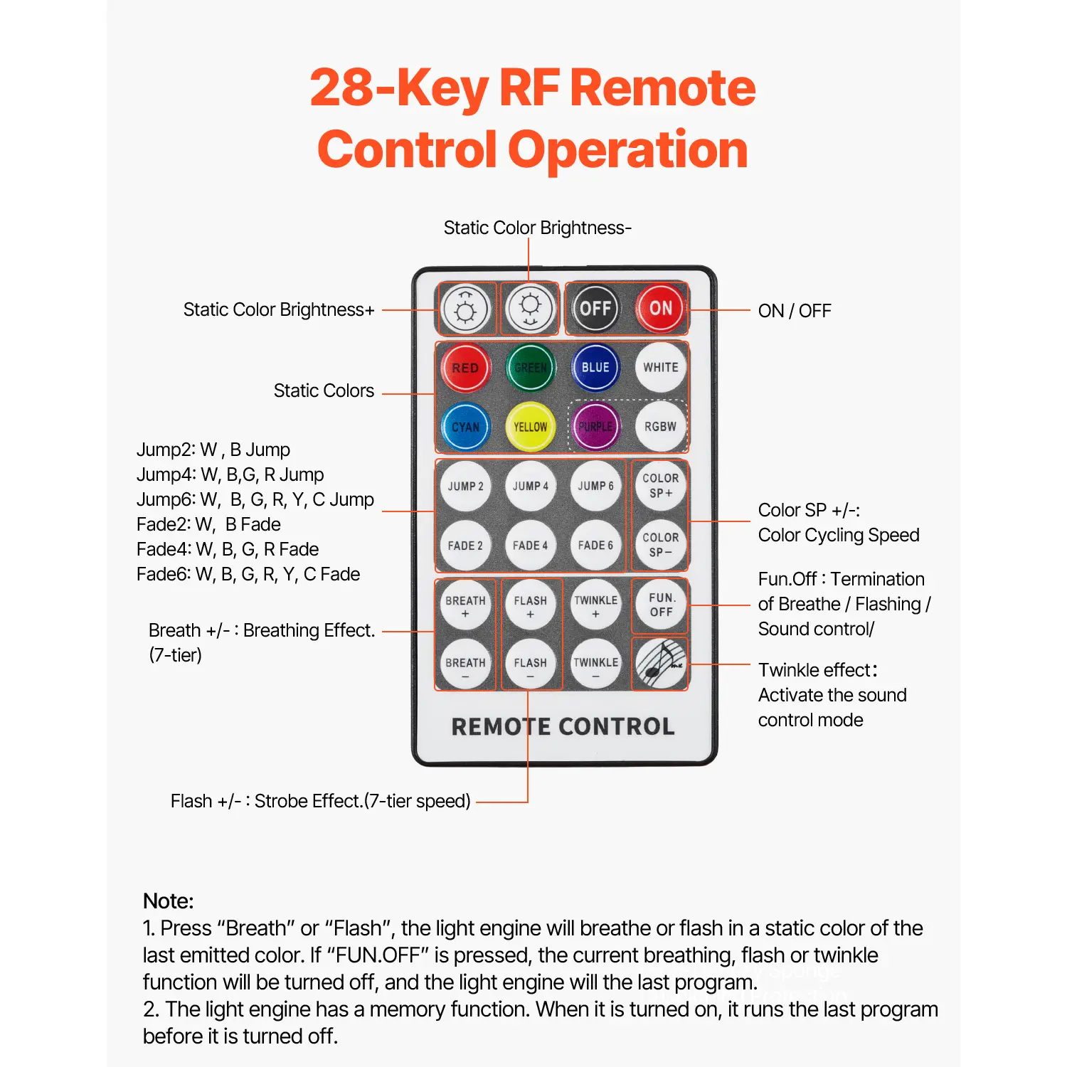 Easily switch between 20 dynamic modes using the 28-key RF remote. Choose from static, jump, fade, flash, twinkle, and breathing effects. Perfect for any mood or occasion. Enjoy a versatile atmosphere with this kit.