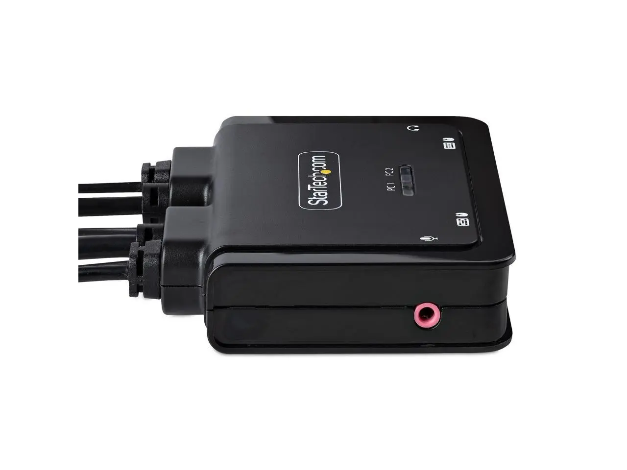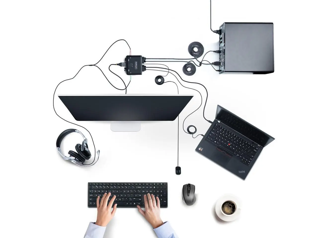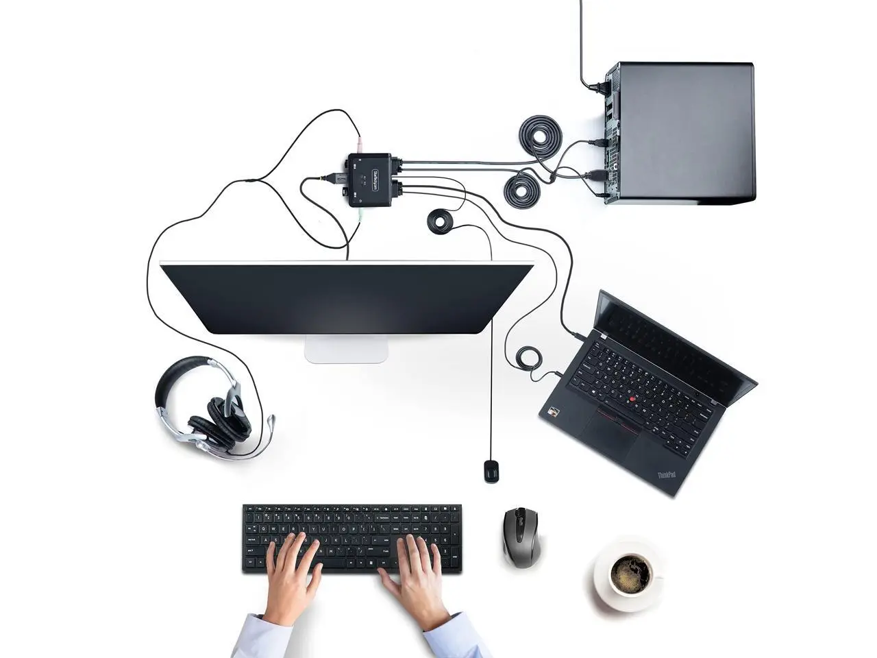 CompatibilityThe 2-port KVM switch is compatible with all operating systems, including Windows, macOS, ChromeOS, and Linux. The KVM works with all hardware platforms including Intel, AMD, and Apple M1/M2. The USB-C host port works with USB-C, USB4, Thunderbolt 3, and Thunderbolt 4 laptops. If the desktop does not have a 4-position 3.5 mm port the included 3.5 mm Headset Adapter ensures compatibility out of the box. Intuitive ControlThe KVM switch offers two options to switch between hosts - a remote push button or hotkey commands. The remote push button includes a 1.5 m cable for optimal placement in the setup.