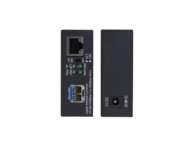 This Gigabit Ethernet to fiber media converter offers a reliable way to extend your network up to 20 km (12.4 mi) using single-mode LC fiber, providing increased range, enhanced security, and reduced interference compared to copper-based connections. It's TAA compliant and designed for government and commercial applications where long-distance and rack-mountable fiber access is needed. Convert 10/100/1000 Mbps RJ-45 to Gigabit LC fiber using a media converter that complies with IEEE 802.3 standards. It supports full/half duplex, auto-negotiation, MDI/MDI-X, and 9K jumbo frames for high-performance networking in mixed copper-fiber environments. Built with a compact full metal chassis, this converter includes LED indicators for power and link activity, plus a DIP switch to enable Link Fault Passthrough (LFP) with LLCF/LLR for easier network troubleshooting and reliability. Deploy in minutes with plug-and-play setup and multiple mounting options including wall-mount, DIN-rail, or media chassis installation. It includes a 5V DC, 2A power adapter, making it ideal for server rooms or network closets.